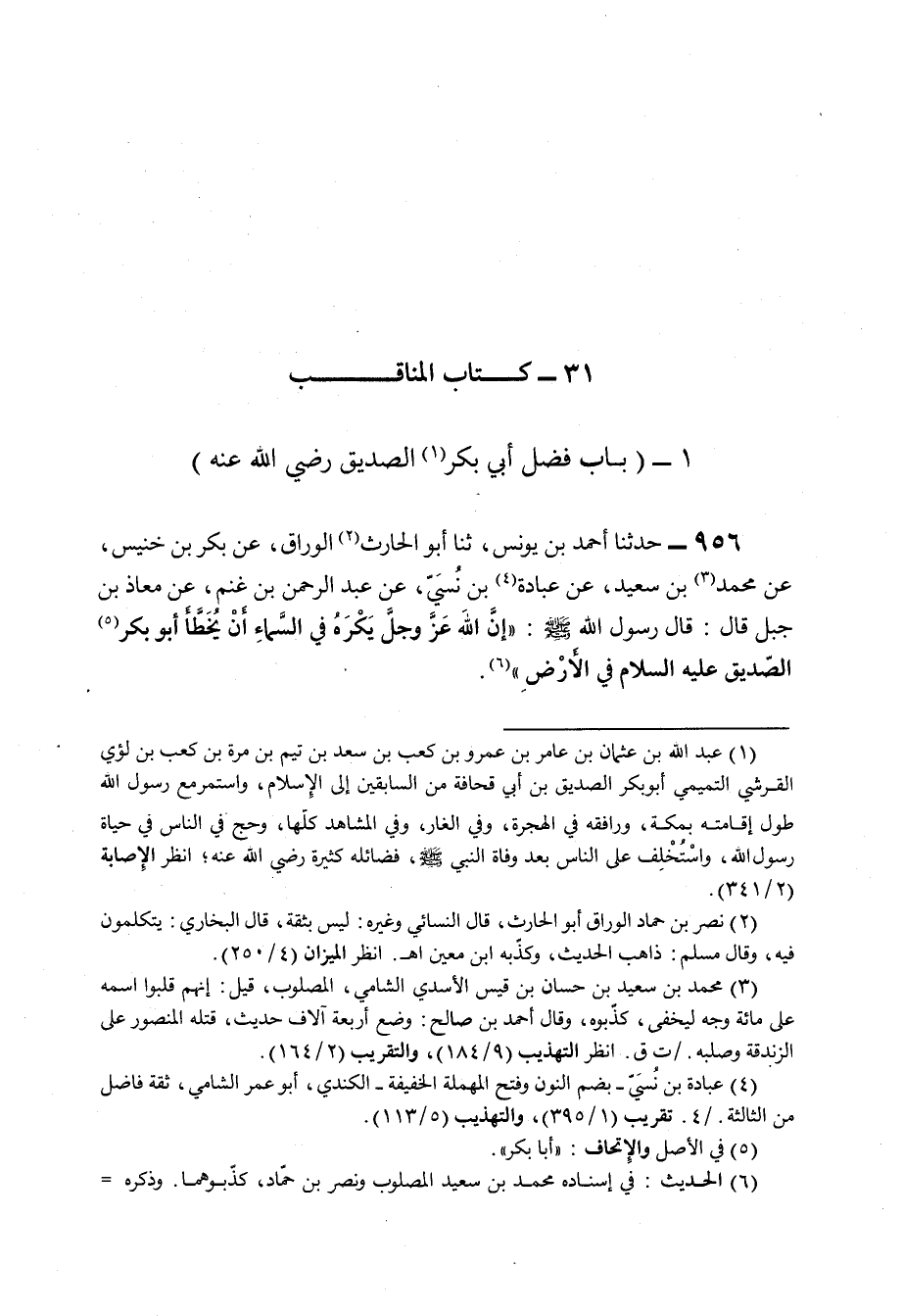 956 - حَدَّثَنَا أَحْمَدُ بْنُ يُونُسَ , ثنا أَبُو الْحَارِثِ الْوَرَّاقُ , عَنْ بَكْرِ بْنِ خُنَيْسٍ , عَنْ مُحَمَّدِ بْنِ سَعِيدٍ , عَنْ عُبَادَةَ بْنِ نَسِيٍّ , عَنْ عَبْدِ الرَّحْمَنِ بْنِ غَنْمٍ , عَنْ مُعَاذِ بْنِ جَبَلٍ قَالَ: قَالَ رَسُولُ اللَّهِ صَلَّى اللهُ عَلَيْهِ وَسَلَّمَ: إِنَّ «§اللَّهَ عَزَّ وَجَلَّ يَكْرَهُ فِي السَّمَاءِ أَنْ يُخَطَّأَ أَبُو بَكْرٍ الصِّدِّيقُ عَلَيْهِ السَّلَامُ فِي الْأَرْضِ»