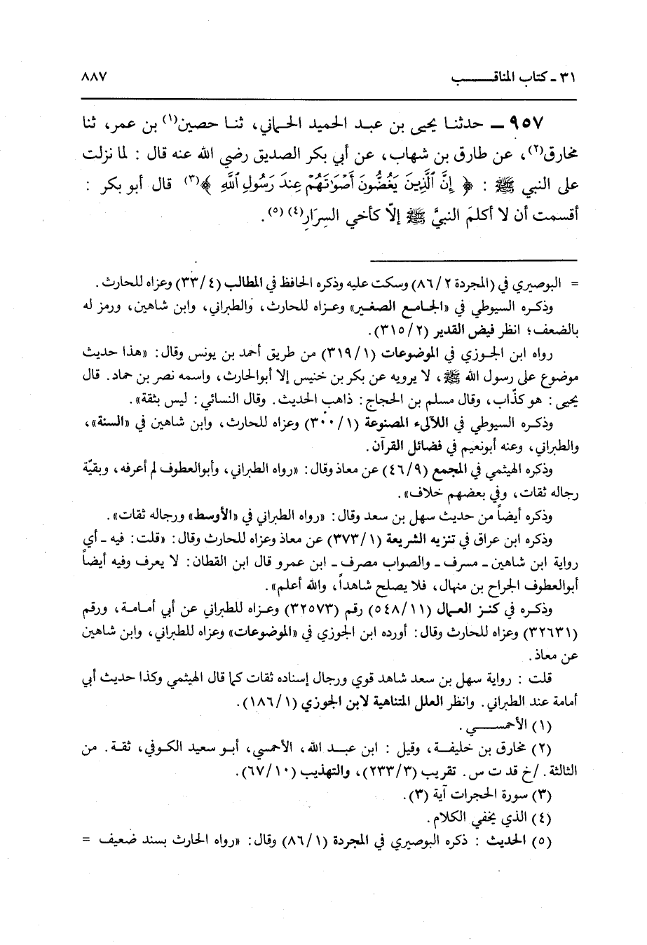 957 - حَدَّثَنَا يَحْيَى بْنُ عَبْدِ الْحَمِيدِ الْحِمَّانِيُّ , ثنا حُصَيْنُ بْنُ عُمَرَ , ثنا مُخَارِقٌ , عَنْ طَارِقِ بْنِ شِهَابٍ , عَنْ أَبِي بَكْرٍ الصِّدِّيقِ رَضِيَ اللَّهُ عَنْهُ قَالَ: لَمَّا نَزَلَتْ عَلَى النَّبِيِّ صَلَّى اللهُ عَلَيْهِ وَسَلَّمَ " {§إِنَّ الَّذِينَ يَغُضُّونَ أَصْوَاتَهُمْ عِنْدَ رَسُولِ اللَّهِ} [الحجرات: 3] قَالَ أَبُو بَكْرٍ: أَقْسَمْتُ أَنْ لَا أُكَلِّمَ النَّبِيَّ صَلَّى اللهُ عَلَيْهِ وَسَلَّمَ إِلَّا كَأَخِي السِّرَارِ "