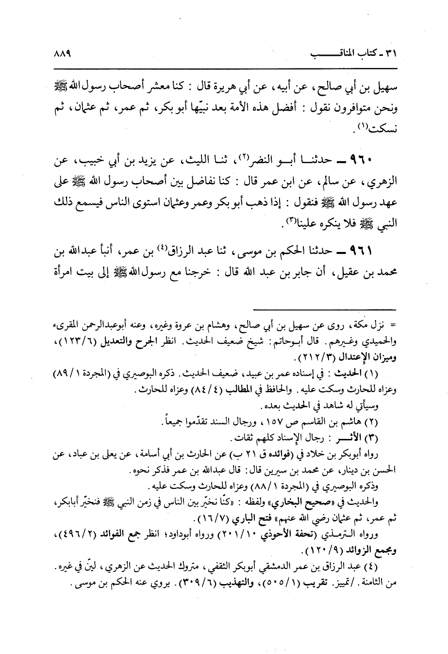 960 - حَدَّثَنَا أَبُو النَّضْرِ , ثنا اللَّيْثُ , عَنْ يَزِيدَ بْنِ أَبِي خَبِيبٍ , عَنِ الزُّهْرِيِّ , عَنْ سَالِمٍ , عَنِ ابْنِ عُمَرَ قَالَ: كُنَّا " §نُفَاضِلُ بَيْنَ أَصْحَابِ رَسُولِ اللَّهِ صَلَّى اللهُ عَلَيْهِ وَسَلَّمَ عَلَى عَهْدِ رَسُولِ اللَّهِ صَلَّى اللهُ عَلَيْهِ وَسَلَّمَ , فَنَقُولُ: إِذَا ذَهَبَ أَبُو بَكْرٍ وَعُمَرُ وَعُثْمَانُ اسْتَوَى النَّاسُ , فَيَسْمَعُ ذَلِكَ النَّبِيُّ صَلَّى اللهُ عَلَيْهِ وَسَلَّمَ فَلَا يُنْكِرُهُ عَلَيْنَا "