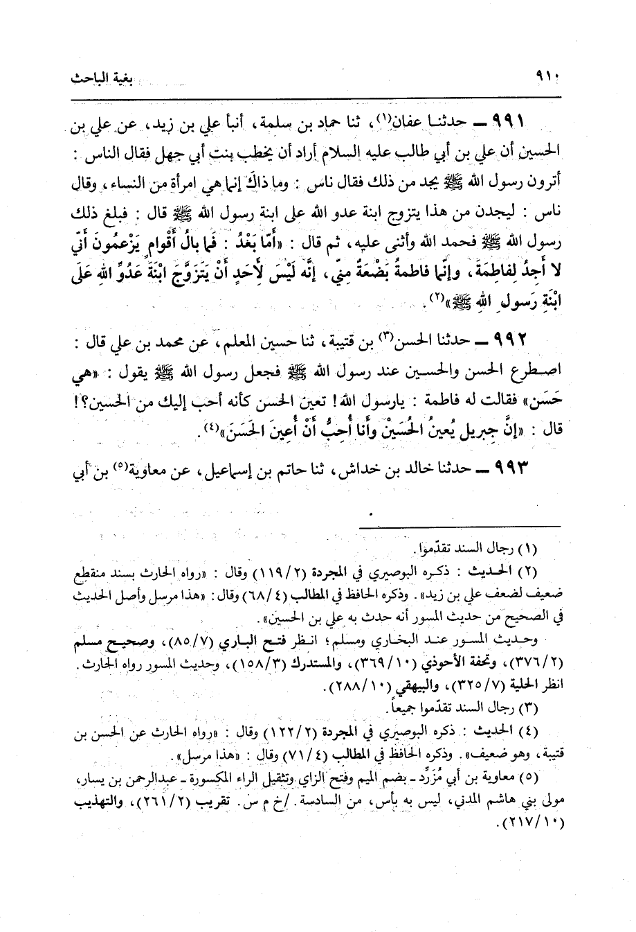 991 - حَدَّثَنَا عَفَّانُ , ثنا حَمَّادُ بْنُ سَلَمَةَ , أَنْبَأَ عَلِيُّ بْنُ زَيْدٍ , عَنْ عَلِيِّ بْنِ الْحُسَيْنِ , أَنَّ عَلِيَّ بْنَ أَبِي طَالِبٍ , عَلَيْهِ السَّلَامُ أَرَادَ أَنْ يَخْطُبَ بِنْتَ أَبِي جَهْلٍ , فَقَالَ النَّاسُ: أَتَرَوْنَ رَسُولَ اللَّهِ صَلَّى اللهُ عَلَيْهِ وَسَلَّمَ يَجِدُ مِنْ ذَلِكَ , فَقَالَ نَاسٌ: وَمَا ذَاكَ إِنَّمَا هِيَ امْرَأَةٌ مِنَ النِّسَاءِ , وَقَالَ نَاسٌ: لَيَجِدَنَّ مِنْ هَذَا يَتَزَوَّجُ ابْنَةَ عَدُوِّ اللَّهِ عَلَى ابْنَةِ رَسُولِ اللَّهِ صَلَّى اللهُ عَلَيْهِ وَسَلَّمَ , قَالَ: فَبَلَغَ ذَلِكَ رَسُولَ اللَّهِ صَلَّى اللهُ عَلَيْهِ وَسَلَّمَ فَحَمِدَ اللَّهَ وَأَثْنَى عَلَيْهِ ثُمَّ قَالَ: «§أَمَّا بَعْدُ فَمَا بَالُ أَقْوَامٍ يَزْعُمُونَ أَنِّي لَا أَجِدُ لِفَاطِمَةَ , وَإِنَّمَا فَاطِمَةُ بَضْعَةٌ مِنِّي , إِنَّهُ لَيْسَ لِأَحَدٍ أَنْ يَتَزَوَّجَ ابْنَةَ عَدُوِّ اللَّهِ عَلَى ابْنَةِ رَسُولِ اللَّهِ صَلَّى اللهُ عَلَيْهِ وَسَلَّمَ»