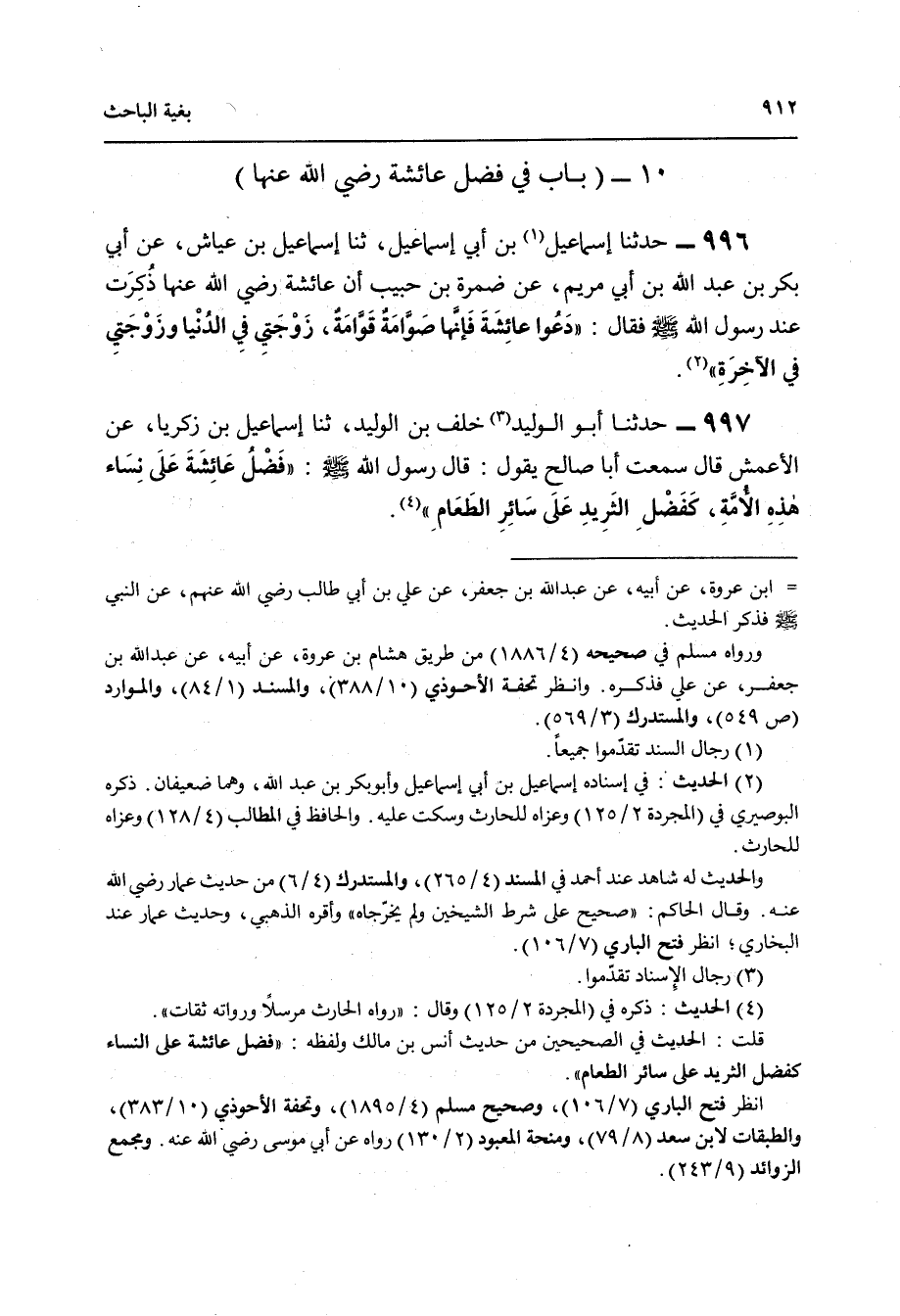 997 - حَدَّثَنَا أَبُو الْوَلِيدِ خَلَفُ بْنُ الْوَلِيدِ , ثنا إِسْمَاعِيلُ بْنُ زَكَرِيَّا , عَنِ الْأَعْمَشِ قَالَ: سَمِعْتُ أَبَا صَالِحٍ يَقُولُ: قَالَ رَسُولُ اللَّهِ صَلَّى اللهُ عَلَيْهِ وَسَلَّمَ: «§فَضْلُ عَائِشَةَ عَلَى نِسَاءِ هَذِهِ الْأُمَّةِ كَفَضْلِ الثَّرِيدِ عَلَى سَائِرِ الطَّعَامِ»