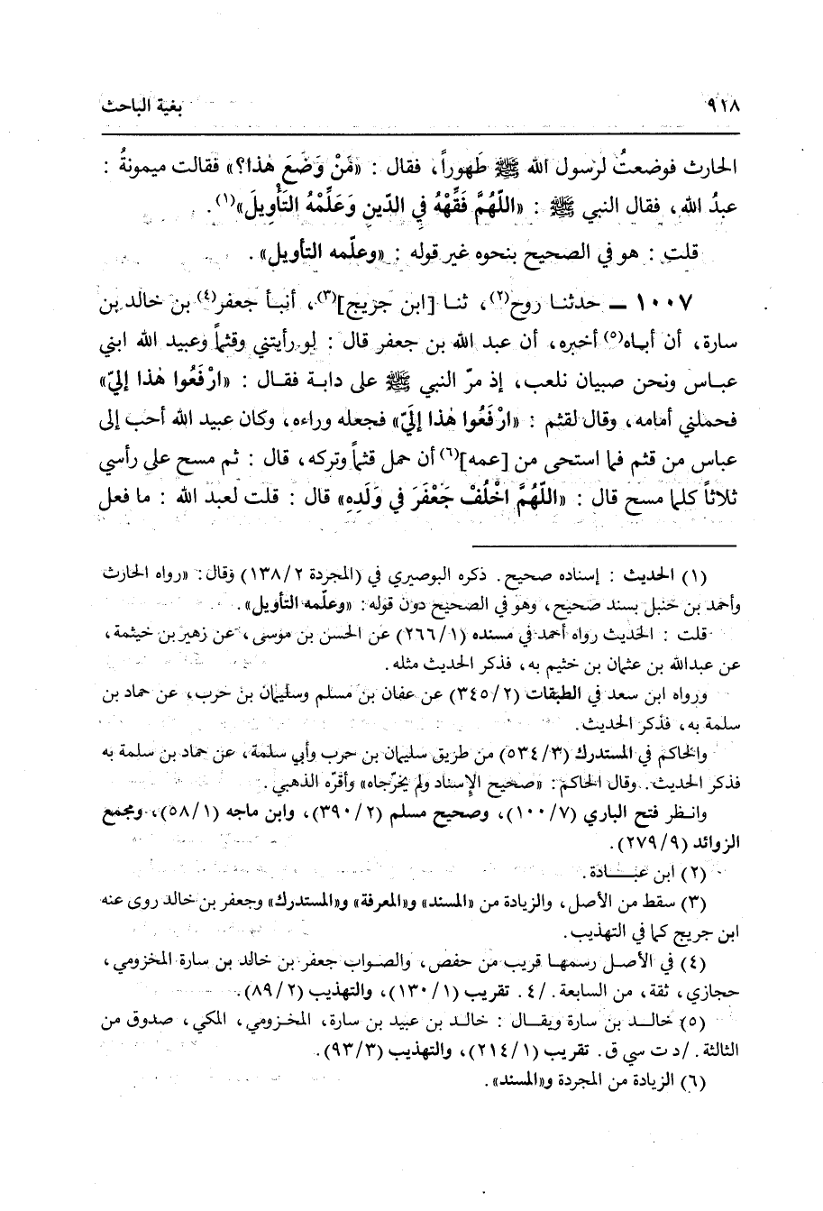 1007 - حَدَّثَنَا رَوْحٌ , ثنا ابْنُ جُرَيْجٍ , أَنْبَأَ جَعْفَرُ بْنُ خَالِدِ بْنِ سَارَةَ , أَنَّ أَبَاهُ , أَخْبَرَهُ أَنَّ عَبْدَ اللَّهِ بْنَ جَعْفَرٍ قَالَ: لَوْ رَأَيْتُنِي وَقُثَمَ وَعُبَيْدَ اللَّهِ ابْنَيْ عَبَّاسٍ وَنَحْنُ صِبْيَانُ نَلْعَبُ إِذْ مَرَّ النَّبِيُّ صَلَّى اللهُ عَلَيْهِ وَسَلَّمَ عَلَى دَابَّةٍ فَقَالَ: «§ارْفَعُوا هَذَا إِلَيَّ» , فَحَمَلَنِي أَمَامَهُ وَقَالَ لِقُثَمٍ: «ارْفَعُوا هَذَا إِلَيَّ» , فَجَعَلَهُ وَرَاءَهُ , وَكَانَ عُبَيْدُ اللَّهِ أَحَبُّ إِلَى عَبَّاسٍ مِنْ قُثَمَ , فَلَمَّا اسْتَحَى مِنْ عَمِّهِ أَنْ حَمَلَ قُثَمَ وَتَرَكَهُ قَالَ: ثُمَّ مَسَحَ عَلَى رَأْسِي ثَلَاثًا كُلَّمَا مَسَحَ قَالَ: «اللَّهُمَّ اخْلُفْ جَعْفَرًا فِي وَلَدِهِ» , قَالَ: قُلْتُ لِعَبْدِ اللَّهِ: مَا فَعَلَ قَثْمٌ؟ قَالَ: اسْتُشْهِدَ , قُلْتُ: اللَّهُ أَعْلَمُ وَرَسُولُهُ بِالْخَيْرِ , قَالَ: أَجَلْ "
