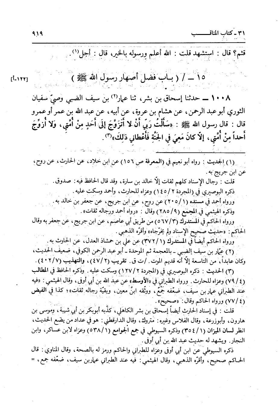 1008 - حَدَّثَنَا إِسْحَاقُ بْنُ بِشْرٍ , ثَنَا عَمَّارُ بْنُ سَيْفٍ الضَّبِّيُّ , وَصِيُّ سُفْيَانَ الثَّوْرِيِّ أَبُو عَبْدِ الرَّحْمَنِ , عَنْ هِشَامِ بْنِ عُرْوَةَ , عَنْ أَبِيهِ , عَنْ عَبْدِ اللَّهِ بْنِ عُمَرَ أَوْ عَمْرٍو قَالَ: قَالَ رَسُولُ اللَّهِ صَلَّى اللهُ عَلَيْهِ وَسَلَّمَ: «§سَأَلْتُ رَبِّي أَنْ لَا أَتَزَوَّجَ إِلَى أَحَدٍ مِنْ أُمَّتِي وَلَا أُزَوِّجَ أَحَدًا مِنْ أُمَّتِي إِلَّا كَانَ مَعِي فِي الْجَنَّةِ فَأَعْطَانِي ذَلِكَ»