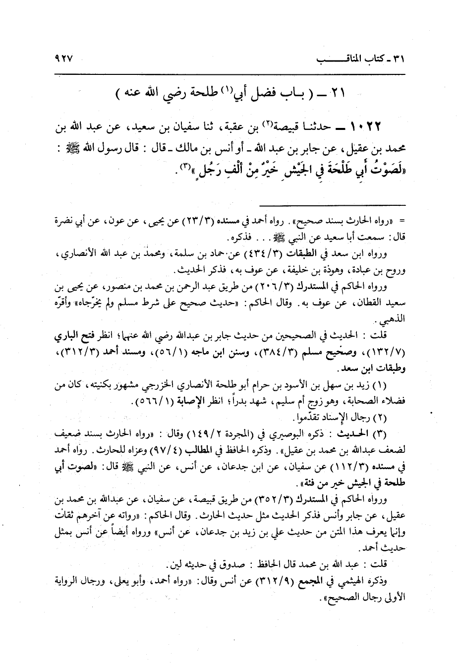 1022 - حَدَّثَنَا قَبِيصَةُ بْنُ عُقْبَةَ , ثنا سُفْيَانُ بْنُ سَعِيدٍ , عَنْ عَبْدِ اللَّهِ بْنِ مُحَمَّدِ بْنِ عَقِيلٍ , عَنْ جَابِرِ بْنِ عَبْدِ اللَّهِ أَوْ أَنَسِ بْنِ مَالِكٍ قَالَ: قَالَ رَسُولُ اللَّهِ صَلَّى اللهُ عَلَيْهِ وَسَلَّمَ: «§لَصَوْتُ أَبِي طَلْحَةَ فِي الْجَيْشِ خَيْرٌ مِنْ أَلْفِ رَجُلٍ»