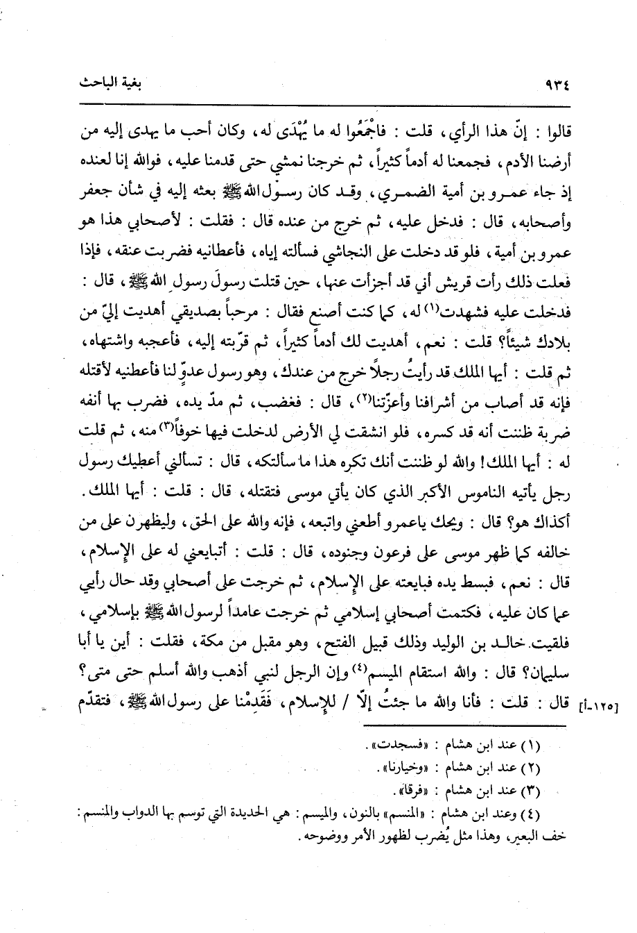قَالُوا: إِنَّ هَذَا الرَّأْيُ، قُلْتُ: فَاجْمَعُوا لَهُ مَا يُهْدَى لَهُ، وَكَانَ أَحَبُّ مَا يُهْدَى إِلَيْهِ مِنْ أَرْضِنَا الأُدُمُ، فَجَمَعْنَا لَهُ أُدُمًا كَثِيرًا، ثُمَّ خَرَجْنَا نَمْشِي حَتَّى قَدِمْنَا عَلَيْهِ, فَوَالله إِنَّا لَعِنْدَهُ, إِذْ جَاءَ عَمْرُو بْنُ أُمَيَّةَ الضَّمْرِيُّ, وَقَدْ كَانَ رَسُولُ الله صَلى الله عَلَيه وَسَلمَ بَعَثَهُ إِلَيْهِ فِي شَأْنِ جَعْفَرَ وَأَصْحَابِهِ، قَالَ: فَدَخَلَ عَلَيْهِ, ثُمَّ خَرَجَ مِنْ عِنْدِهِ، قَالَ: فَقُلْتُ لإِصْحَابِي: هَذَا هُوَ عَمْرُو بْنُ أُمَيَّةَ، فَلَوْ قَدْ دَخَلْتُ عَلَى النَّجَاشِيِّ فَسَأَلْتُهُ إِيَّاهُ فَأَعْطَانِيهِ, فَضَرَبْتُ عُنُقَهُ، فَإِذَا فَعَلْتُ ذَلِكَ رَأَتْ قُرَيْشٌ أَنِّي قَدْ أَجْزَأْتُ عَنْهَا حِينَ قَتَلْتُ رَسُولَ رَسُولِ الله صَلى الله عَلَيه وَسَلمَ، قَالَ: فَدَخَلْتُ عَلَيْهِ, فَشَهِدْتُ لَهُ كَمَا كُنْتُ أَصْنَعُ، فَقَالَ: مَرْحَبًا بِصَدِيقِي, أَهْدَيْتَ إِلَيَّ مِنْ بِلاَدِكَ شَيْئًا؟ قُلْتُ: نَعَمْ، أَهْدَيْت لَكَ أُدُمًا كَثِيرًا، ثُمَّ قَرَّبْتُهُ إِلَيْهِ, فَأَعْجَبَهُ وَاشْتَهَاهُ، ثُمَّ قُلْتُ: أَيُّهَا الْمَلِكُ، قَدْ رَأَيْتُ رَجُلاً خَرَجَ مِنْ عِنْدِكَ وَهُوَ رَسُولُ عَدُوٍّ لَنَا, فَأَعْطِنِيهِ لإِقْتُلَهُ، فَإِنَّهُ قَدْ أَصَابَ مِنْ أَشْرَافِنَا وَأَعِزَّتِنَا، قَالَ: فَغَضِبَ, ثُمَّ مَدَّ يَدَهُ فَضَرَبَ بِهَا أَنْفَهُ ضَرْبَةً, ظَنَنْتُ أَنَّهُ قَدْ كَسَرَهُ، فَلَوِ انْشَقَّتْ لِي الأَرْضُ لَدَخَلْتُ فِيهَا خَوْفًا مِنْهُ، ثُمَّ قُلْتُ لَهُ: أَيُّهَا الْمَلِكُ، وَالله لَوْ ظَنَنْتُ أَنَّكَ تَكْرَهُ هَذَا مَا سَأَلْتُكَهُ، قَالَ: تَسْأَلُنِي أُعْطِيكَ رَسُولَ رَجُلٍ يَأْتِيهِ النَّامُوسُ الأَكْبَرُ, الَّذِي كَانَ يَأْتِي مُوسَى فَتَقْتُلَهُ، قَالَ: قُلْتُ: أَيُّهَا الْمَلِكُ، أَكَذَاكَ هُوَ؟ قَالَ: وَيْحَكَ يَا عَمْرُو, أَطِعْنِي وَاتَّبِعْهُ, فَإِنَّهُ وَالله عَلَى حَقٍّ، وَلَيَظْهَرَنَّ عَلَى مَنْ خَالَفَهُ كَمَا ظَهَرَ مُوسَى عَلَى فِرْعَوْنَ وَجُنُودِهِ، قَالَ: قُلْتُ: أَتُبَايِعُنِي لَهُ عَلَى الإِسْلاَمِ؟ قَالَ: نَعَمْ، فَبَسَطَ يَدَهُ, فَبَايَعْتُهُ عَلَى الإِسْلاَمِ، ثُمَّ خَرَجْتُ عَلَى أَصْحَابِي وَقَدْ حَالَ رَأْيِي عَمَّا كَانَ عَلَيْهِ، فَكَتَمْتُ أَصْحَابِي إِسْلاَمِي، ثُمَّ خَرَجْتُ عَامِدًا لِرَسُولِ الله صَلى الله عَلَيه وَسَلمَ بِإِسْلاَمِي، فَلَقِيتُ خَالِدَ بْنَ الْوَلِيدِ, وَذَلِكَ قُبَيْلُ الْفَتْحِ, وَهُوَ مُقْبِلٌ مِنْ مَكَّةَ، فَقُلْتُ: أَيْنَ يَا أَبَا سُلَيْمَانَ؟ قَالَ: وَالله اسْتَقَامَ الْمِيسَمُ, وَإِنَّ الرَّجُلَ لَنَبِيٌّ، اذْهَبْ وَالله أَسْلِمْ، حَتَّى مَتَى؟ قَالَ: قُلْتُ: فَأَنَا وَالله مَا جِئْتُ إِلاَّ لِلإِسْلاَمِ، فَقَدِمْنَا عَلَى رَسُولِ الله صَلى الله عَلَيه وَسَلمَ, فَتَقَدَّمَ خَالِدُ بْنُ الْوَلِيدِ فَأَسْلَمَ, وَتَابَعَ وَبَايَعَ، ثُمَّ دَنَوْتُ, فَقُلْتُ: يَا رَسُولَ الله, إِنِّي أُبَايِعُكَ عَلَى أَنْ تَغْفِرَ لِي مَا تَقَدَّمَ مِنْ ذَنْبِي, وَلاَ أَذْكُرَ مَا تَأَخَّرَ، قَالَ: فَقَالَ رَسُولُ الله صَلى الله عَلَيه وَسَلمَ: يَا عَمْرُو, بَايِعْ, فَإِنَّ الإِسْلاَمَ يَجُبُّ مَا كَانَ قَبْلَهُ، وَإِنَّ الْهِجْرَةَ تَجُبُّ مَا كَانَ قَبْلَهَا، قَالَ: فَبَايَعْتُ, ثُمَّ انْصَرَفْتُ.