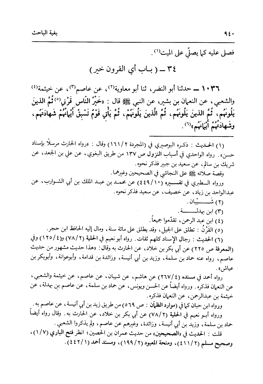 1036 - حَدَّثَنَا أَبُو النَّضْرِ , ثنا أَبُو مُعَاوِيَةَ , عَنْ عَاصِمٍ , عَنْ خَيْثَمَةَ , وَالشَّعْبِيِّ , عَنِ النُّعْمَانِ بْنِ بَشِيرٍ عَنِ النَّبِيِّ صَلَّى اللهُ عَلَيْهِ وَسَلَّمَ قَالَ: «§خَيْرُ النَّاسِ قَرْنِي ثُمَّ الَّذِينَ يَلُونَهُمْ ثُمَّ الَّذِينَ يَلُونَهُمْ ثُمَّ الَّذِينَ يَلُونَهُمْ ثُمَّ يَأْتِي قَوْمٌ تَسْبِقُ أَيْمَانُهُمْ شَهَادَتَهُمْ وَشَهَادَتُهُمْ أَيْمَانَهُمْ»