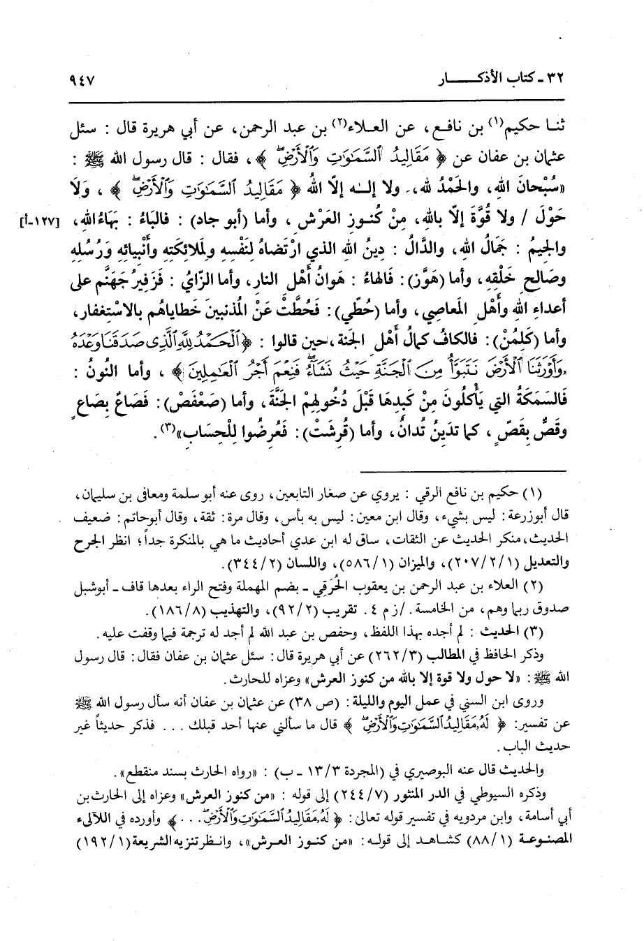 1045- حَدَّثنا عَبْدُ الرَّحْمَنِ بْنُ وَاقِدٍ، حَدَّثنا حَفْصُ بْنُ عَبْدِ الله الإِفْرِيقِيُّ، حَدَّثنا حَكِيمُ بْنُ نَافِعٍ، عَنِ الْعَلاَءِ بْنِ عَبْدِ الرَّحْمَنِ، عَنْ أَبِي هُرَيْرَةَ قَالَ: سُئِلَ عُثْمَانُ بْنُ عَفَّانَ عَنْ {مَقَالِيدُ السَّمَاوَاتِ وَالأَرْضِ}، فَقَالَ: قَالَ رَسُولُ الله صَلى الله عَلَيه وَسَلمَ: سُبْحَانَ الله, وَالْحَمْدُ لِلَّهِ, وَلاَ إِلَهَ إِلاَّ الله، {مَقَالِيدُ السَّمَاوَاتِ وَالأَرْضِ}، وَلاَ حَوْلَ وَلاَ قُوَّةَ إِلاَّ بِالله مِنْ كُنُوزِ الْعَرْشِ، وَأَمَّا أَبُو (جَادٍّ) فَالْبَاءُ بَهَاءُ الله, وَالْجِيمُ جَمَالُ الله, وَالدَّالُ دِينُ الله الَّذِي ارْتَضَاهُ لِنَفْسِهِ وَلِمَلاَئِكَتِهِ وَأَنْبِيَائِهِ وَرُسُلِهِ وَصَالِحِ خَلْقِهِ، وَأَمَّا هَوَّزَ فَالْهَاءُ هَوَانُ أَهْلِ النَّارِ، وَأَمَّا الزَّاي فَزَفِيرُ جَهَنَّمَ عَلَى أَعْدَاءِ الله وَأَهْلِ الْمَعَاصِي، وَأَمَّا حُطِّي فَحُطَّتْ عَنِ الْمُذْنِبِينَ خَطَايَاهُمْ بِالِاسْتِغْفَارِ، وَأَمَّا كَلِمُنْ فَالْكَافُ كَمَالُ أَهْلِ الْجَنَّةِ حِينَ قَالُوا: {الْحَمْدُ لِلَّهِ الَّذِي صَدَقَنَا وَعْدَهُ وَأَوْرَثَنَا الأَرْضَ نَتَبَوَّأُ مِنَ الْجَنَّةِ حَيْثُ نَشَاءُ فَنِعْمَ أَجْرُ الْعَامِلِينَ} وَأَمَّا النُّونُ فَالسَّمَكَةُ الَّتِي يَأْكُلُونَ مِنْ كَبِدِهَا قَبْلَ دُخُولِهِمُ الْجَنَّةَ، وَأَمَّا صَعْفَصُ فَصَاعٌ بِصَاعٍ وَقَصٌّ بِقَصٍّ كَمَا تَدِينُ تُدَانُ، وَأَمَّا قُرِشَتْ, فَعُرِضُوا لِلْحِسَابِ.