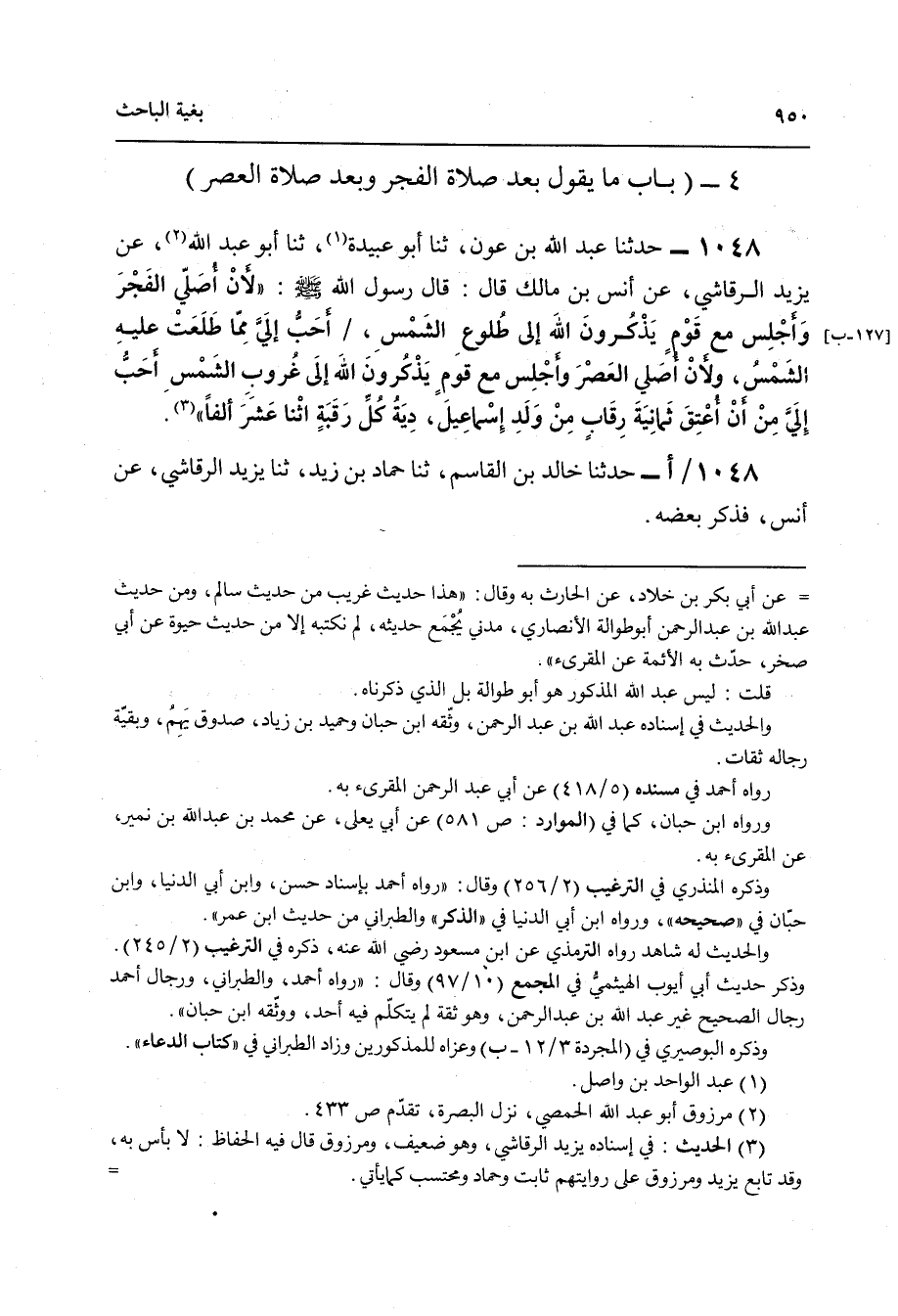 1048 - حَدَّثَنَا عَبْدُ اللَّهِ بْنُ عَوْنٍ , ثنا أَبُو عُبَيْدَةَ , ثنا أَبُو عَبْدِ اللَّهِ , عَنْ يَزِيدَ الرَّقَاشِيِّ , عَنْ أَنَسِ بْنِ مَالِكٍ قَالَ: قَالَ رَسُولُ اللَّهِ صَلَّى اللهُ عَلَيْهِ وَسَلَّمَ: «§لَأَنَّ أُصَلِّيَ الْفَجْرَ وَأَجْلِسَ مَعَ قَوْمٍ يَذْكُرُونَ اللَّهَ إِلَى طُلُوعِ الشَّمْسِ أَحَبُّ إِلَيَّ مِمَّا طَلَعَتْ عَلَيْهِ الشَّمْسُ، وَلَأَنْ أُصَلِّيَ الْعَصْرَ وَأَجْلِسَ مَعَ قَوْمٍ يَذْكُرُونَ اللَّهَ إِلَى غُرُوبِ الشَّمْسِ أَحَبُّ إِلَيَّ مِنْ أَنْ أُعْتِقَ ثَمَانِيَةَ رِقَابٍ مِنْ وَلَدِ إِسْمَاعِيلَ، دِيَةُ كُلِّ رَقَبَةٍ اثَنَا عَشَرَ أَلْفًا» حَدَّثَنَا خَالِدُ بْنُ الْقَاسِمِ , ثنا حَمَّادُ بْنُ زَيْدٍ , ثنا يَزِيدُ الرَّقَاشِيُّ , عَنْ أَنَسٍ , فَذَكَرَ بَعْضَهُ