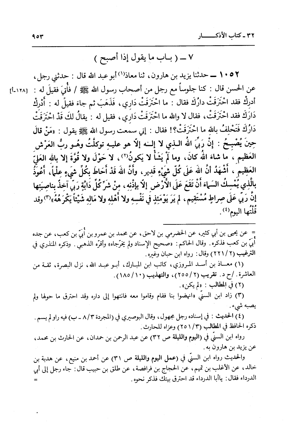 1052 - حَدَّثَنَا يَزِيدُ بْنُ هَارُونَ , ثنا مُعَاذٌ أَبُو عَبْدِ اللَّهِ قَالَ: حَدَّثَنِي رَجُلٌ , عَنِ الْحَسَنِ قَالَ: كُنَّا جُلُوسًا مَعَ رَجُلٍ مِنْ أَصْحَابِ رَسُولِ اللَّهِ صَلَّى اللهُ عَلَيْهِ وَسَلَّمَ، فَأُتِيَ فَقِيلَ لَهُ: أَدْرِكْ فَقَدِ احْتَرَقَتْ دَارُكَ , فَقَالَ: مَا احْتَرَقَتْ دَارِي , فَذَهَبَ ثُمَّ جَاءَ فَقِيلَ لَهُ: أَدْرِكْ دَارَكَ فَقَدِ احْتَرَقَتْ , فَقَالَ: لَا وَاللَّهِ مَا احْتَرَقَتْ دَارِي , فَقِيلَ لَهُ: يُقَالُ لَكَ قَدِ احْتَرَقَتْ دَارُكَ، فَتَحْلِفُ بِاللَّهِ مَا احْتَرَقَتْ , فَقَالَ: إِنِّي سَمِعْتُ رَسُولَ اللَّهِ صَلَّى اللهُ عَلَيْهِ وَسَلَّمَ يَقُولُ: " §مَنْ قَالَ حِينَ يُصْبِحُ: إِنَّ رَبِّيَ اللَّهُ الَّذِي لَا إِلَهَ إِلَّا هُوَ , عَلَيْهِ تَوَكَّلْتُ وَهُوَ رَبُّ الْعَرْشِ الْعَظِيمُ , مَا شَاءَ اللَّهُ كَانَ، وَمَا لَمْ يَشَأُ لَا يَكُونُ , لَا حَوْلَ وَلَا قُوَّةَ إِلَّا بِاللَّهِ الْعَلِيِّ الْعَظِيمِ , أَشْهَدُ أَنَّ اللَّهَ عَلَى كُلِّ شَيْءٍ قَدِيرٌ , وَأَنَّ اللَّهَ قَدْ أَحَاطَ بِكُلِّ شَيْءٍ عِلْمًا , أَعُوذُ بِالَّذِي يُمْسِكُ السَّمَاءَ أَنْ تَقَعَ عَلَى الْأَرْضِ إِلَّا بِإِذْنِهِ مِنْ شَرِّ كُلِّ دَابَّةٍ رَبِّي آخِذٌ بِنَاصِيَتِهَا إِنَّ رَبِّي عَلَى صِرَاطٍ مُسْتَقِيمٍ , لَمْ يَرَ يَوْمَئِذٍ فِي نَفْسِهِ وَلَا أَهْلِهِ وَلَا مَالِهِ شَيْئًا يَكْرَهُهُ «, وَقَدْ قُلْتُهَا الْيَوْمَ»