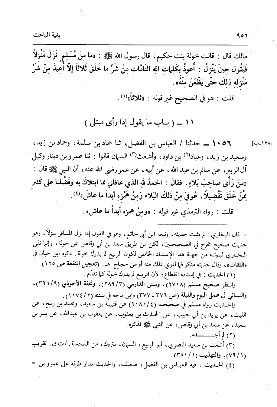 1056 - حَدَّثَنَا الْعَبَّاسُ بْنُ الْفَضْلِ , ثنا حَمَّادُ بْنُ سَلَمَةَ , وَحَمَّادُ بْنُ زَيْدٍ , وَسَعِيدُ بْنُ زَيْدٍ , وَعَبَّادُ بْنُ دَاوُدَ , وَأَشْعَثُ السَّمَّانُ قَالُوا: ثنا عَمْرُو بْنُ دِينَارٍ وَكِيلُ آلِ الزُّبَيْرِ , عَنْ سَالِمِ بْنِ عَبْدِ اللَّهِ , عَنْ أَبِيهِ , عَنْ عُمَرَ رَضِيَ اللَّهُ عَنْهُ أَنَّ النَّبِيَّ صَلَّى اللهُ عَلَيْهِ وَسَلَّمَ قَالَ: " §مَنْ رَأَى صَاحِبَ بَلَاءٍ فَقَالَ: الْحَمْدُ لِلَّهِ الَّذِي عَافَانِي مِمَّا ابْتَلَاكَ بِهِ وَفَضَّلَنَا عَلَى كَثِيرٍ مِمَّنْ خَلَقَ تَفْضِيلًا، عُوفِيَ مِنْ ذَلِكَ الْبَلَاءِ وَمِنْ هَمْزِهِ أَبَدًا مَا عَاشَ " , قُلْتُ: رَوَاهُ التِّرْمِذِيُّ غَيْرَ قَوْلِهِ: «وَمِنْ هَمْزِهِ أَبَدًا مَا عَاشَ»