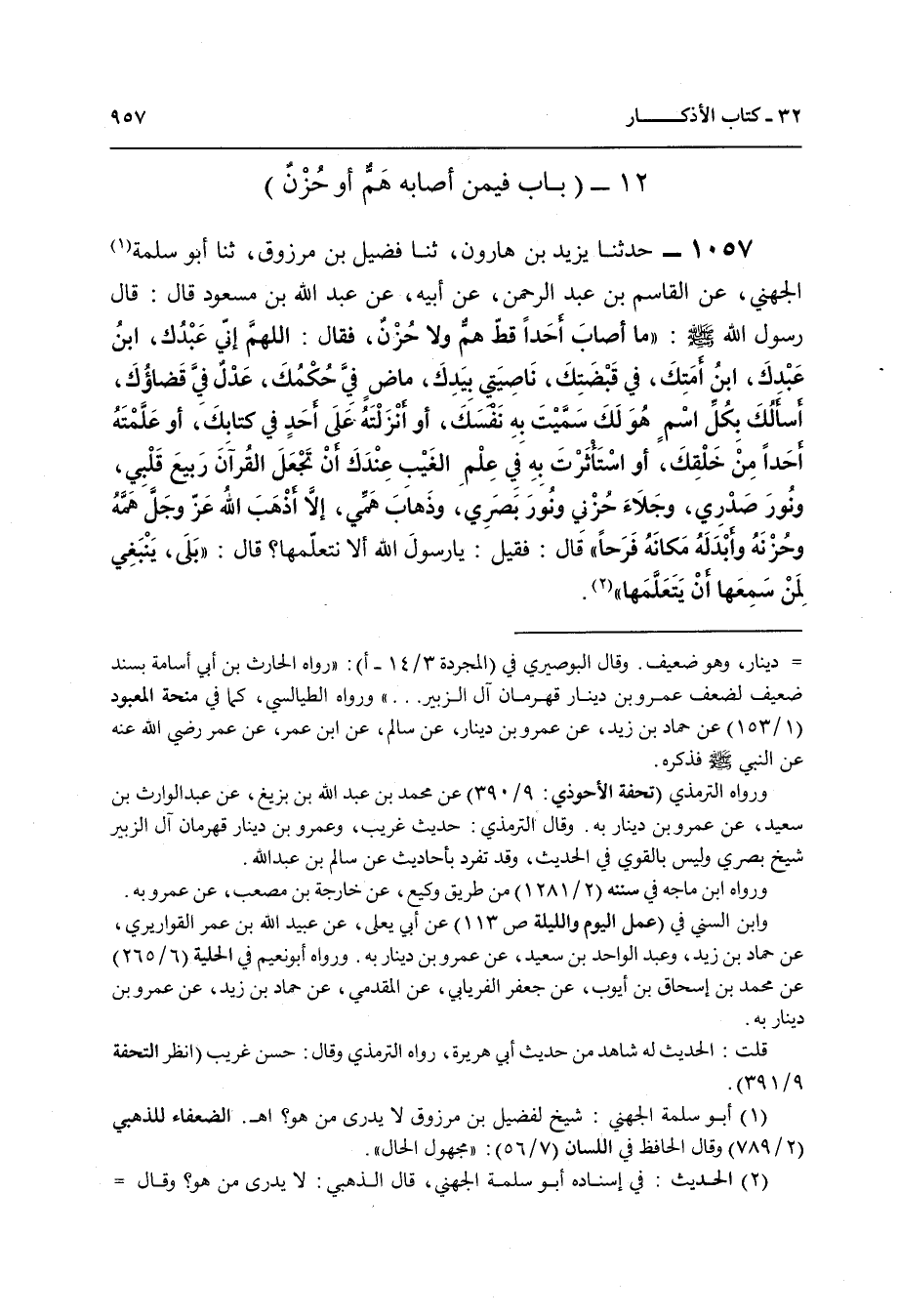 1057 - حَدَّثَنَا يَزِيدُ بْنُ هَارُونَ , ثنا فُضَيْلُ بْنُ مَرْزُوقٍ , ثنا أَبُو سَلَمَةَ الْجُهَنِيُّ , عَنِ الْقَاسِمِ بْنِ عَبْدِ الرَّحْمَنِ , عَنْ أَبِيهِ , عَنْ عَبْدِ اللَّهِ بْنِ مَسْعُودٍ قَالَ: قَالَ رَسُولُ اللَّهِ صَلَّى اللهُ عَلَيْهِ وَسَلَّمَ: " §مَا أَصَابَ أَحَدًا قَطُّ هَمٌّ وَلَا حُزْنٌ فَقَالَ: اللَّهُمَّ إِنِّي عَبْدُكَ، ابْنُ عَبْدِكَ، ابْنُ أَمَتِكَ , فِي قَبْضَتِكَ، نَاصِيَتِي بِيَدِكَ , مَاضٍ فِيَّ حُكْمُكَ , عَدْلٌ فِيَّ قَضَاؤُكَ , أَسْأَلُكَ بِكُلِّ اسْمٍ هُوَ لَكَ، سَمَّيْتَ بِهِ نَفْسَكَ , أَوْ أَنْزَلْتَهُ عَلَى أَحَدٍ فِي كِتَابِكَ , أَوْ عَلَّمْتَهُ أَحَدًا مِنْ خَلْقِكَ، أَوِ اسْتَأْثَرْتَ بِهِ فِي عِلْمِ الْغَيْبِ عِنْدَكَ، أَنْ تَجْعَلَ الْقُرْآنَ رَبِيعَ قَلْبِي، وَنُورَ صَدْرِي، وَجَلَاءَ حُزْنِي، وَنُورَ بَصَرِي، وَذَهَابَ هَمِّي، إِلَّا أَذْهَبَ اللَّهُ عَزَّ وَجَلَّ هَمَّهُ وَحُزْنَهُ وَأَبْدَلَهُ مَكَانَهُ فَرَحًا " , قَالَ: فَقِيلَ: يَا رَسُولَ اللَّهِ، أَلَا نَتَعَلَّمُهَا؟ قَالَ: «بَلَى، يَنْبَغِي لِمَنْ سَمِعَهَا أَنْ يَتَعَلَّمَهَا»