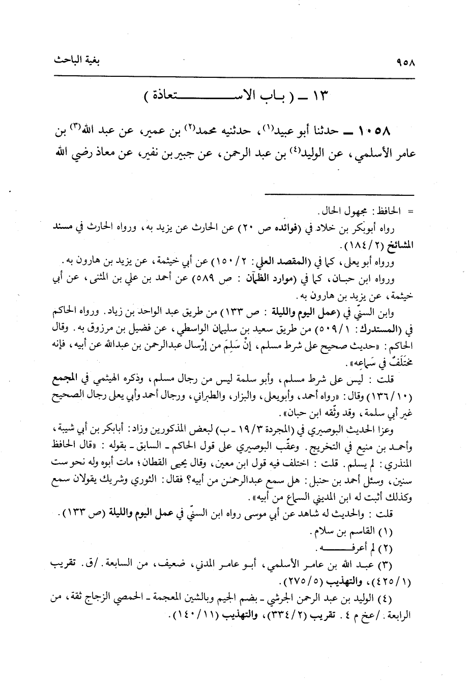 1058 - حَدَّثَنَا أَبُو عُبَيْدٍ , حَدَّثَنِيهِ مُحَمَّدُ بْنُ عُمَيْرٍ , عَنْ عَبْدِ اللَّهِ بْنِ عَامِرٍ الْأَسْلَمِيِّ , عَنِ الْوَلِيدِ بْنِ عَبْدِ الرَّحْمَنِ , عَنْ جُبَيْرِ بْنِ نُفَيْرٍ , عَنْ مُعَاذٍ رَضِيَ اللَّهُ عَنْهُ عَنِ النَّبِيِّ صَلَّى اللهُ عَلَيْهِ وَسَلَّمَ قَالَ: «§اسْتَعِيذُوا بِاللَّهِ مِنْ طَمَعٍ يَهْدِي إِلَى طَبْعٍ»