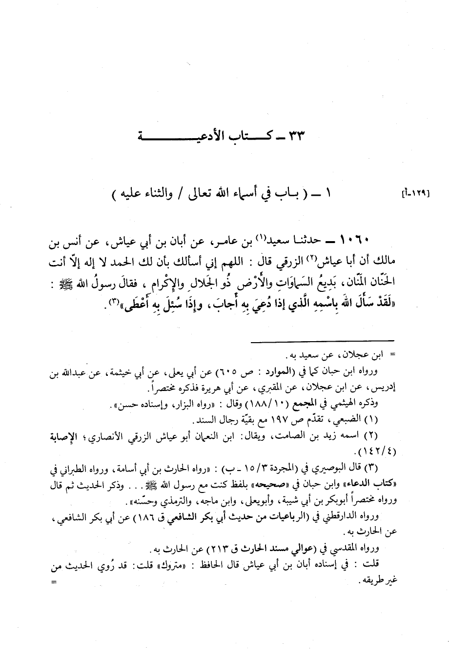 1060 - حَدَّثَنَا سَعِيدُ بْنُ عَامِرٍ , عَنْ أَبَانَ بْنِ أَبِي عَيَّاشٍ , عَنْ أَنَسِ بْنِ مَالِكٍ , أَنَّ أَبَا عَيَّاشٍ الزُّرَقِيَّ قَالَ: " اللَّهُمَّ إِنِّي أَسْأَلُكَ بِأَنَّ لَكَ الْحَمْدَ لَا إِلَهَ إِلَّا أَنْتَ الْحَنَّانُ الْمَنَّانُ بَدِيعُ السَّمَوَاتِ وَالْأَرْضِ ذُو الْجَلَالِ وَالْإِكْرَامِ , فَقَالَ رَسُولُ اللَّهِ صَلَّى اللهُ عَلَيْهِ وَسَلَّمَ: «لَقَدْ §سَأَلَ اللَّهَ بِاسْمِهِ الَّذِي إِذَا دُعِيَ بِهِ أَجَابَ وَإِذَا سُئِلَ بِهِ أَعْطَى»