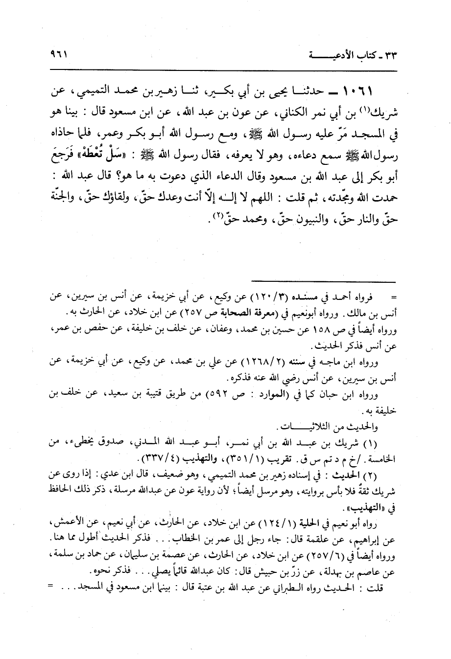 1061 - حَدَّثَنَا يَحْيَى بْنُ أَبِي بُكَيْرٍ , ثنا زُهَيْرُ بْنُ مُحَمَّدٍ التَّمِيمِيُّ , عَنْ شَرِيكِ بْنِ أَبِي نَمِرٍ الْكِنَانِيِّ , عَنْ عَوْنِ بْنِ عَبْدِ اللَّهِ , عَنِ ابْنِ مَسْعُودٍ قَالَ: بَيْنَا هُوَ فِي الْمَسْجِدِ مَرَّ عَلَيْهِ رَسُولُ اللَّهِ صَلَّى اللهُ عَلَيْهِ وَسَلَّمَ وَمَعَ رَسُولِ اللَّهِ أَبُو بَكْرٍ وَعُمَرُ , فَلَمَّا حَاذَاهُ رَسُولُ اللَّهِ صَلَّى اللهُ عَلَيْهِ وَسَلَّمَ سَمِعَ دُعَاءَهُ وَهُوَ لَا يَعْرِفُهُ , فَقَالَ رَسُولُ اللَّهِ صَلَّى اللهُ عَلَيْهِ وَسَلَّمَ: «§سَلْ تُعْطَهْ» , فَرَجَعَ أَبُو بَكْرٍ إِلَى عَبْدِ اللَّهِ بْنِ مَسْعُودٍ وَقَالَ: الدُّعَاءُ الَّذِي دَعَوْتَ بِهِ مَا هُوَ؟ قَالَ عَبْدُ اللَّهِ: حَمِدْتُ اللَّهَ وَمَجَّدْتُهُ ثُمَّ قُلْتُ: اللَّهُمَّ لَا إِلَهَ إِلَّا أَنْتَ وَعْدُكَ حَقٌّ وَلِقَاؤُكَ حَقٌّ وَالْجَنَّةُ حَقٌّ وَالنَّارُ حَقٌّ وَالنَّبِيُّونَ حَقٌّ وَمُحَمَّدٌ حَقٌّ "