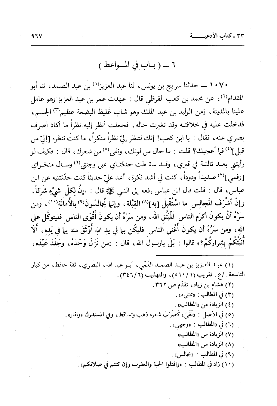 1070 - حَدَّثَنَا سُرَيْجُ بْنُ يُونُسَ , ثنا عَبْدُ الْعَزِيزِ بْنُ عَبْدِ الصَّمَدِ , ثنا أَبُو الْمِقْدَامِ , عَنْ مُحَمَّدِ بْنِ كَعْبٍ الْقُرَظِيِّ قَالَ: عَهِدْتُ عُمَرَ بْنَ عَبْدِ الْعَزِيزِ وَهُوَ عَامِلٌ عَلَيْنَا بِالْمَدِينَةِ زَمَنَ الْوَلِيدِ بْنِ عَبْدِ الْمَلِكِ وَهُوَ شَابٌّ غَلِيظُ الْبَضْعَةِ عَظِيمُ الْجِسْمِ , فَدَخَلْتُ عَلَيْهِ فِي خِلَافَتِهِ وَقَدْ تَغَيَّرَتْ حَالُهُ، فَجَعَلْتُ أَنْظُرُ إِلَيْهِ نَظَرًا مَا أَكَادُ أَصْرِفُ بَصَرِي عَنْهُ , فَقَالَ: يَا ابْنَ كَعْبٍ إِنَّكَ لَتَنْظُرُ إِلَيَّ نَظَرًا مُنْكَرًا , مَا كُنْتَ تَنْظُرُهُ إِلَيَّ مِنْ قَبْلُ , فَمَا أَعْجَبَكَ؟ قُلْتُ: مَا حَالَ مِنْ لَوْنِكَ وَنَفَى مِنْ شَعْرِكَ؟ قَالَ: فَكَيْفَ لَوْ رَأَيْتَنِي بَعْدَ ثَالِثَةٍ فِي قَبْرِي وَقَدْ سَقَطَتْ حْدَقَتَايَ عَلَى وَجْنَتَيَّ وَسَالَ مِنْخَرَايَ وَفَمِي صَدِيدًا وَدُودًا كُنْتَ لِي أَشَدَّ نُكْرَةً , أَعِدْ عَلَيَّ حَدِيثًا كُنْتَ حَدَّثْتَنِيهِ عَنِ ابْنِ عَبَّاسٍ , قَالَ: قُلْتُ: قَالَ ابْنُ عَبَّاسٍ , رَفَعَهُ إِلَى النَّبِيِّ صَلَّى اللهُ عَلَيْهِ وَسَلَّمَ قَالَ: «إِنَّ §لِكُلِّ شَيْءٍ شَرَفًا , وَإِنْ أَشْرَفَ الْمَجَالِسِ مَا اسْتُقْبِلَ بِهِ الْقِبْلَةُ , وَإِنَّمَا يُجَالَسُونَ بِالْأَمَانَةِ , وَمَنْ سَرَّهُ أَنْ يَكُونَ أَكْرَمَ النَّاسِ فَلْيَتَّقِ اللَّهَ , وَمَنْ سَرَّهُ أَنْ يَكُونَ أَقْوَى النَّاسِ فَلْيَتَوَكَّلْ عَلَى اللَّهِ , وَمَنْ سَرَّهُ أَنْ يَكُونَ أَغْنَى النَّاسِ فَلْيَكُنْ بِمَا فِي يَدِ اللَّهِ أَوْثَقَ مِنْهُ بِمَا فِي يَدِهِ , إِلَّا أُنَبِّئُكُمْ بِشِرَارِكُمْ؟» , قَالُوا: بَلَى يَا رَسُولَ اللَّهِ، قَالَ: " مَنْ نَزَلَ وَحْدَهُ، وَجَلَدَ عَبْدَهُ، وَمَنَعَ رِفْدَهُ , أَلَا أُنَبِّئُكُمْ بِشْرٍ مِنْ هَذَا؟ قَالُوا: بَلَى يَا رَسُولَ اللَّهِ، قَالَ: " مَنْ يُبْغِضُ النَّاسَ وَيُبْغِضُونَهُ , أَلَا أُنَبِّئُكُمْ بِشْرٍ مِنْ هَذَا؟ قَالُوا: بَلَى يَا رَسُولَ اللَّهِ , قَالَ: «الَّذِي لَا يَقِيلُ عَثْرَةً، وَلَا يَغْفِرُ ذَنْبًا» , قَالَ: " أَلَا أُنَبِّئُكُمْ بِشْرٍ مِنْ هَذَا؟ قَالُوا: بَلَى يَا رَسُولَ اللَّهِ , قَالَ: " مَنْ لَا يُرْجَى خَيْرُهُ، وَلَا يُؤْمَنُ شَرُّهُ , وَإِنْ عِيسَى ابْنَ مَرْيَمَ قَامَ فِي بَنِي إِسْرَائِيلَ فَقَالَ: يَا بَنِي إِسْرَائِيلَ، لَا تَكَلَّمُوا بِالْحِكْمَةِ عِنْدَ الْجُهَّالِ فَتَظْلِمُوهَا، وَلَا تَمْنَعُوهَا أَهْلَهَا فَتَظْلِمُوهُمْ , وَلَا تَظْلِمُوا وَلَا تُكاَفِئُوا ظَالِمًا فَيَبْطُلَ فَضْلُكُمْ , يَا بَنِي إِسْرَائِيلَ، إِنَّمَا الْأَمْرُ ثَلَاثَةٌ: أَمْرٌ بَيِّنٌ رُشْدُهُ فَاتَّبِعُوهُ , وَأَمْرٌ بَيِّنٌ زَيْغُهُ فَاجْتَنِبُوهُ , وَأَمْرٌ اخْتُلِفَ فِيهِ فَرَدُّوهُ إِلَى اللَّهِ "