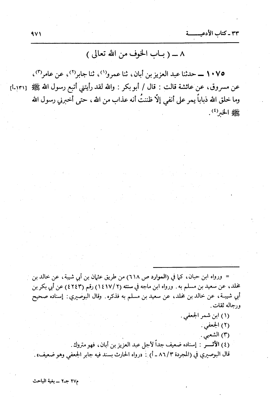 1075 - حَدَّثَنَا عَبْدُ الْعَزِيزِ بْنُ أَبَانَ , ثنا عَمْرٌو , ثنا جَابِرٌ , عَنْ عَامِرٍ , عَنْ مَسْرُوقٍ , عَنْ عَائِشَةَ قَالَتْ: قَالَ أَبُو بَكْرٍ: وَاللَّهِ «§لَقَدْ رَأَيْتُنِي أَتْبَعُ رَسُولَ اللَّهِ صَلَّى اللهُ عَلَيْهِ وَسَلَّمَ وَمَا خَلَقَ اللَّهُ ذُبَابًا يَمُرُّ عَلَى أَنْفِي إِلَّا ظَنَنْتُ أَنَّهُ عَذَابٌ مِنَ اللَّهِ حَتَّى أَخْبَرَنِي رَسُولُ اللَّهِ صَلَّى اللهُ عَلَيْهِ وَسَلَّمَ الْخَبَرَ»