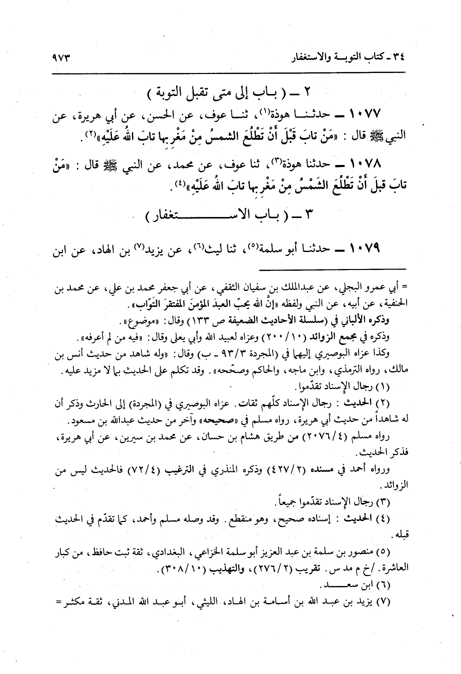 1077 - حَدَّثَنَا هَوْذَةُ , ثنا عَوْفٌ , عَنِ الْحَسَنِ , عَنْ أَبِي هُرَيْرَةَ عَنِ النَّبِيِّ صَلَّى اللهُ عَلَيْهِ وَسَلَّمَ قَالَ: «§مَنْ تَابَ قَبْلَ أَنْ تَطْلُعَ الشَّمْسُ مِنْ مَغْرِبِهَا تَابَ اللَّهُ عَلَيْهِ»