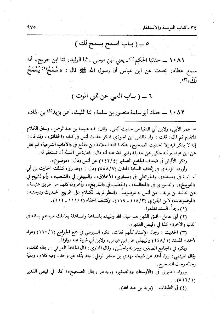 1082 - حَدَّثَنَا أَبُو سَلَمَةَ مَنْصُورُ بْنُ سَلَمَةَ , ثنا اللَّيْثُ , عَنْ يَزِيدَ بْنِ الْهَادِ , عَنْ هِنْدَ بِنْتِ الْحَارِثِ , عَنْ أُمِّ الْفَضْلِ قَالَتْ: دَخَلَ النَّبِيُّ صَلَّى اللهُ عَلَيْهِ وَسَلَّمَ عَلَى الْعَبَّاسِ وَهُوَ يَشْتَكِي فَتَمَنَّى الْمَوْتَ فَقَالَ: يَا عَبَّاسُ يَا عَمَّ رَسُولِ اللَّهِ صَلَّى اللهُ عَلَيْهِ وَسَلَّمَ «§لَا تَتَمَنَّ الْمَوْتَ فَإِنَّكَ إِنْ تَكُ مُحْسِنًا تَزْدَدْ إِحْسَانًا إِلَى إِحْسَانِكَ خَيْرٌ لَكَ , وَإِنْ كُنْتَ مُسِيئًا اسْتُعْتِبْتَ خَيْرٌ لَكَ فَلَا تَتَمَنَّ الْمَوْتَ»