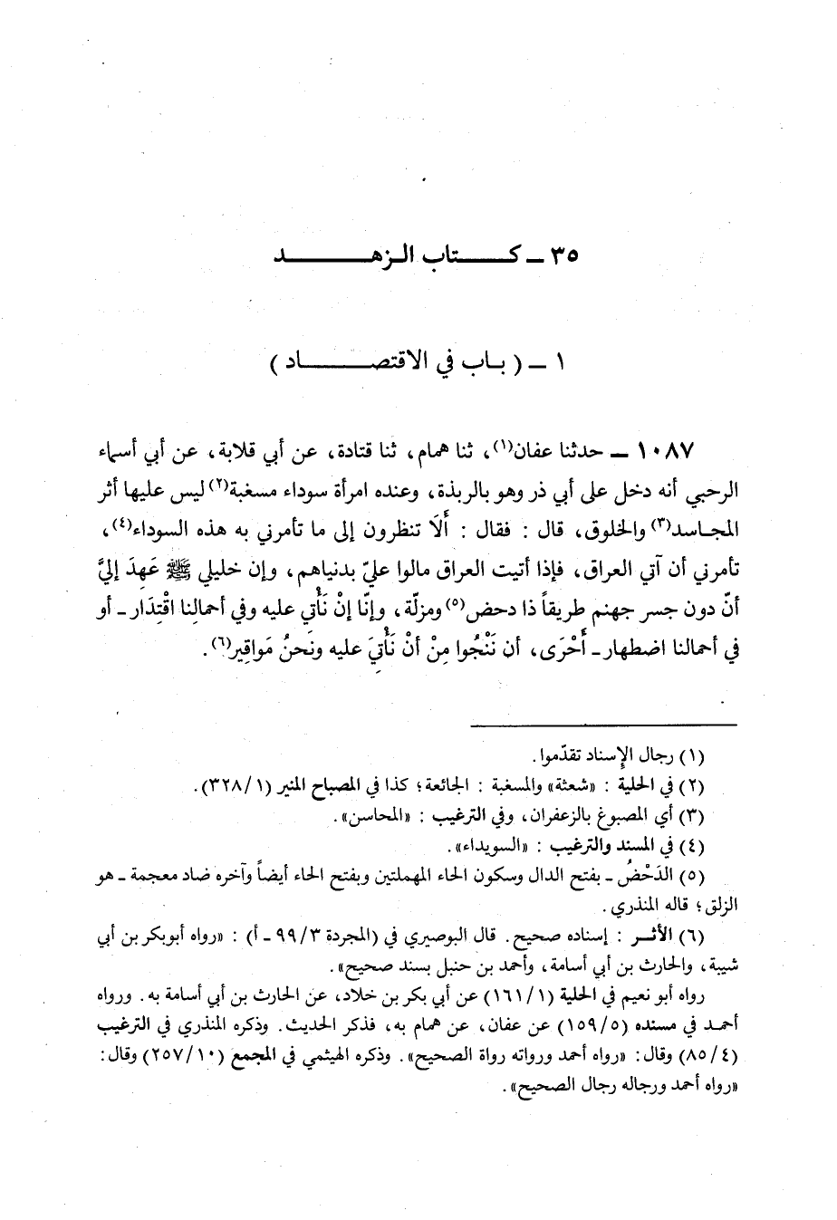 1087 - حَدَّثَنَا عَفَّانُ , ثنا هَمَّامٌ , ثنا قَتَادَةُ , عَنْ أَبِي قِلَابَةَ , عَنْ أَبِي أَسْمَاءَ الرَّحَبِيِّ , أَنَّهُ دَخَلَ عَلَى أَبِي ذَرٍّ وَهُوَ بِالرَّبَذَةِ وَعِنْدَهُ امْرَأَةٌ سَوْدَاءُ مَسْغَبَةٌ لَيْسَ عَلَيْهَا أَثَرُ الْمَجَاسِدِ وَالْخَلُوقِ , قَالَ: فَقَالَ: " أَلَا تَنْظُرُونَ إِلَى مَا تَأْمُرُنِي بِهِ هَذِهِ السَّوْدَاءُ , تَأْمُرُنِي أَنْ آتِيَ الْعِرَاقَ فَإِذَا أَتَيْتُ الْعِرَاقَ مَالُوا عَلَيَّ بِدُنْيَاهُمْ , وَإِنَّ خَلِيلِي صَلَّى اللهُ عَلَيْهِ وَسَلَّمَ عَهِدَ إِلَيَّ: «أَنَّ §دُونَ جِسْرِ جَهَنَّمَ طَرِيقًا ذَا دَحْضٍ وَمَزَلَّةٍ» ، وَإِنَّا إِنْ نَأْتِيَ عَلَيْهِ وَفِي أَحْمَالِنَا اقْتِدَارٌ أَوْ فِي أَحْمَالِنَا اضْطِهَارٌ أَحْرَى أَنْ نَنْجُوَ مِنْ أَنْ نَأْتِيَ عَلَيْهِ وَنَحْنُ مَوَاقِيرُ "