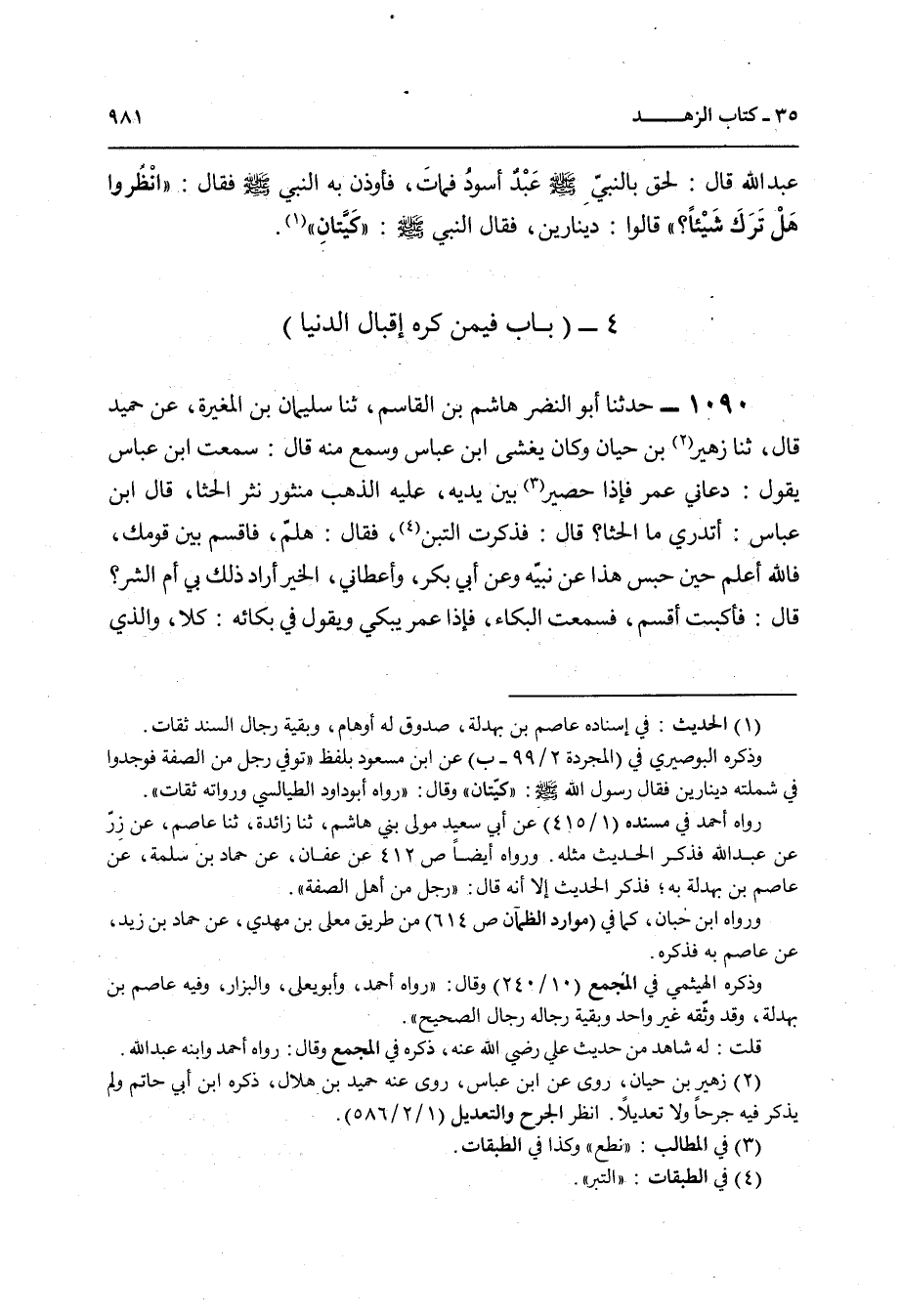 1090 - حَدَّثَنَا أَبُو النَّضْرِ هَاشِمُ بْنُ الْقَاسِمِ , ثنا سُلَيْمَانُ بْنُ الْمُغِيرَةِ , عَنْ حُمَيْدٍ قَالَ: ثنا زُهَيْرُ بْنُ حَيَّانَ , وَكَانَ , يَغْشَى ابْنَ عَبَّاسٍ وَسَمِعَ مِنْهُ قَالَ: سَمِعْتُ ابْنَ عَبَّاسٍ يَقُولُ: " §دَعَانِي عُمَرُ فَإِذَا حَصِيرٌ بَيْنَ يَدَيْهِ عَلَيْهِ الذَّهَبُ مَنْثُورٌ نَثْرَ الْحَثَا , قَالَ ابْنُ عَبَّاسٍ: أَتَدْرِي مَا الْحَثَا؟ قَالَ: فَذَكَرْتُ التِّبْنَ فَقَالَ: هَلُمَّ فَاقْسِمْ بَيْنَ قَوْمِكَ فَاللَّهُ أَعْلَمُ حِينَ حَبَسَ هَذَا عَنْ نَبِيِّهِ وَعَنْ أَبِي بَكْرٍ وَأَعْطَانِي , آلْخَيْرَ أَرَادَ ذَلِكَ بِي أَمِ الشَّرَّ , قَالَ: فَأَكْبَبْتُ أُقَسِّمُ فَسَمِعْتُ الْبُكَاءَ , فَإِذَا عُمَرُ يَبْكِي وَيَقُولُ فِي بُكَائِهِ: كَلَّا وَالَّذِي بَعَثَهُ بِالْحَقِّ مَا حَبَسَ عَنْ نَبِيِّهِ وَعَنْ أَبِي بَكْرٍ إِرَادَةَ الشَّرِّ لَهُمَا وَأَعْطَاهُ عَمْرًا إِرَادَةَ الْخَيْرِ لَهُ "