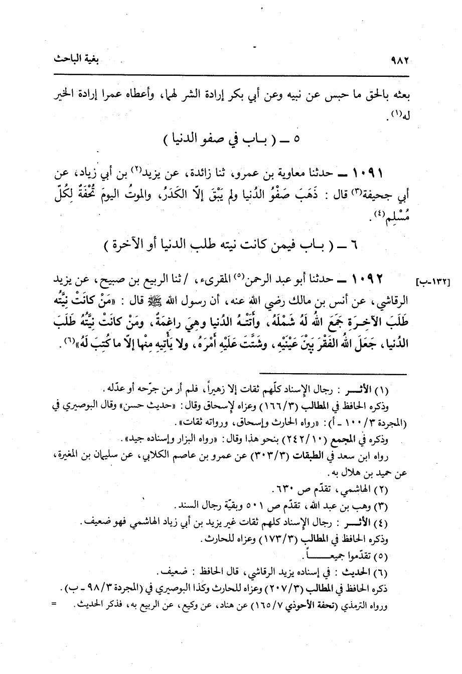 1092 - حَدَّثَنَا أَبُو عَبْدِ الرَّحْمَنِ الْمُقْرِئُ , ثنا الرَّبِيعُ بْنُ صَبِيحٍ , عَنْ يَزِيدَ الرَّقَاشِيُّ , عَنْ أَنَسِ بْنِ مَالِكٍ رَضِيَ اللَّهُ عَنْهُ، أَنَّ رَسُولَ اللَّهِ صَلَّى اللهُ عَلَيْهِ وَسَلَّمَ قَالَ: «§مَنْ كَانَتْ نِيَّتُهُ طَلَبَ الْآخِرَةِ جَمَعَ اللَّهُ لَهُ شَمْلَهُ وَأَتَتْهُ الدُّنْيَا وَهِيَ رَاغِمَةٌ , وَمَنْ كَانَتْ نِيَّتُهُ طَلَبَ الدُّنْيَا جَعَلَ اللَّهُ الْفَقْرَ بَيْنَ عَيْنَيْهِ، وَشَتَّتَ عَلَيْهِ أَمْرَهُ، وَلَا يَأْتِيهِ مِنْهَا إِلَّا مَا كُتِبَ لَهُ»