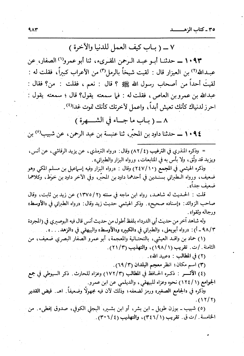 1093 - حَدَّثَنَا أَبُو عَبْدِ الرَّحْمَنِ الْمُقْرِئُ , ثنا أَبُو عَمْرٍو الصَّفَّارُ , عَنْ عَبْدِ اللَّهِ بْنِ الْعَيْزَارِ قَالَ: لَقِيتُ شَيْخًا بِالرَّمْلِ مِنَ الْأَعْرَابِ كَبِيرًا فَقُلْتُ لَهُ: لَقِيتَ أَحَدًا مِنْ أَصْحَابِ رَسُولِ اللَّهِ صَلَّى اللهُ عَلَيْهِ وَسَلَّمَ؟ قَالَ: نَعَمْ , فَقُلْتُ: مَنْ؟ فَقَالَ عَبْدُ اللَّهِ بْنُ عَمْرِو بْنِ الْعَاصِ , فَقُلْتُ لَهُ: فَمَا سَمِعْتَهُ يَقُولُ؟ قَالَ: سَمِعْتُهُ يَقُولُ: «§احْرِزْ لِدُنْيَاكَ كَأَنَّكَ تَعِيشُ أَبَدًا , وَاعْمَلْ لِآخِرَتِكَ كَأَنَّكَ تَمُوتُ غَدًا»