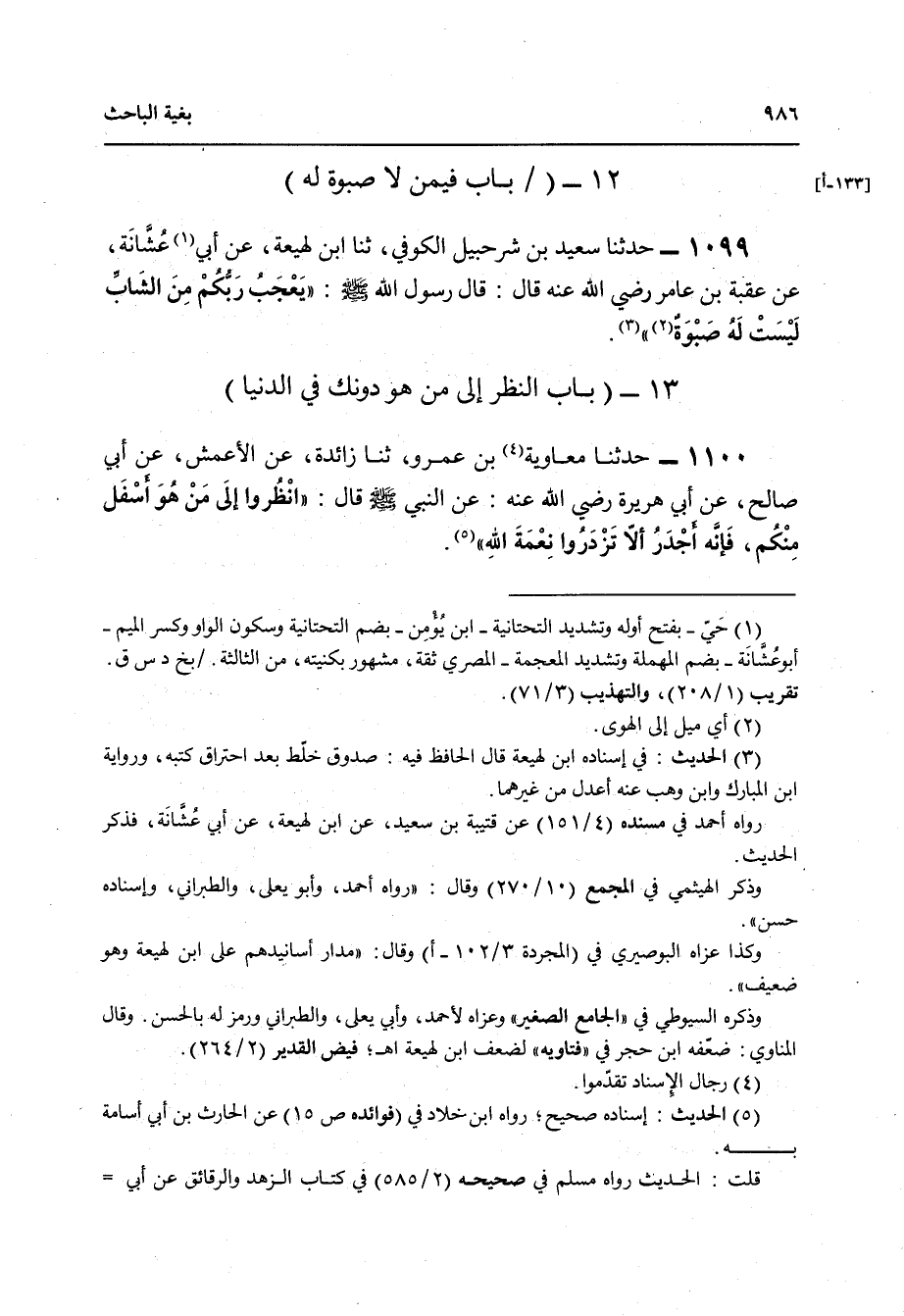 1099 - حَدَّثَنَا سَعِيدُ بْنُ شُرَحْبِيلَ الْكُوفِيُّ , ثنا ابْنُ لَهِيعَةَ , عَنْ أَبِي عُشَّانَةَ , عَنْ عُقْبَةَ بْنِ عَامِرٍ رَضِيَ اللَّهُ عَنْهُ قَالَ: قَالَ رَسُولُ اللَّهِ صَلَّى اللهُ عَلَيْهِ وَسَلَّمَ: «§يَعْجَبُ رَبُّكُمْ مِنَ الشَّابِّ لَيْسَتْ لَهُ صَبْوَةٌ»