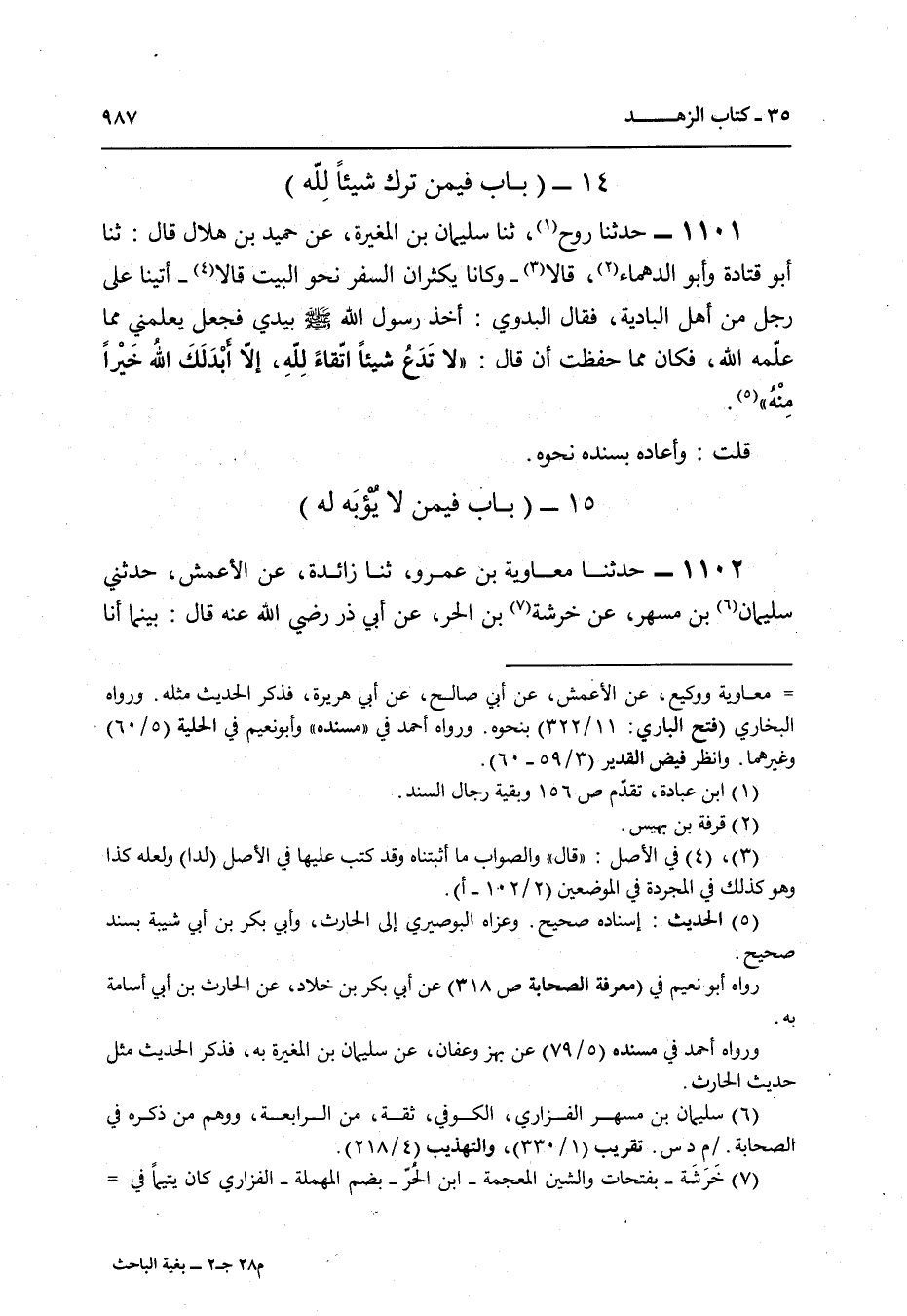 1101 - حَدَّثَنَا رَوْحٌ , ثنا سُلَيْمَانُ بْنُ الْمُغِيرَةِ , عَنْ حُمَيْدِ بْنِ هِلَالٍ قَالَ: ثنا أَبُو قَتَادَةَ , وَأَبُو الدَّهْمَاءِ قَالَا وَكَانَا يُكْثِرَانِ السَّفَرَ نَحْو الْبَيْتِ قَالَا: أَتَيْنَا عَلَى رَجُلٍ مِنْ أَهْلِ الْبَادِيَةِ , فَقَالَ الْبَدَوِيُّ: أَخَذَ رَسُولُ اللَّهِ صَلَّى اللهُ عَلَيْهِ وَسَلَّمَ بِيَدِي فَجَعَلَ يُعَلِّمُنِي مِمَّا عَلَّمَهُ اللَّهُ فَكَانَ مِمَّا حَفِظْتُ أَنْ قَالَ: «§لَا تَدَعُ شَيْئًا اتِّقَاءً لِلَّهِ إِلَّا أَبْدَلَكَ اللَّهُ خَيْرًا مِنْهُ» , قُلْتُ: وَأَعَادَهُ بِسَنَدِهِ نَحْوَهُ