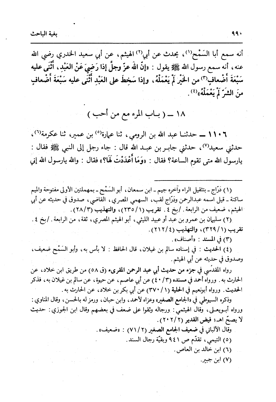 1106 - حَدَّثَنَا عَبْدُ اللَّهِ بْنُ الرُّومِيِّ , ثنا عُمَارَةُ بْنُ عُمَيْرٍ , ثنا عِكْرِمَةُ , حَدَّثَنِي سَعِيدٌ , حَدَّثَنِي جَابِرُ بْنُ عَبْدِ اللَّهِ قَالَ: جَاءَ رَجُلٌ إِلَى النَّبِيِّ صَلَّى اللهُ عَلَيْهِ وَسَلَّمَ فَقَالَ: يَا رَسُولَ اللَّهِ " §مَتَى تَقُومُ السَّاعَةُ؟ فَقَالَ: «وَمَا أَعْدَدْتَ لَهَا؟» فَقَالَ: وَاللَّهِ يَا رَسُولَ اللَّهِ إِنِّي لَضَعِيفُ الْعَمَلِ وَإِنِّي أُحِبُّ اللَّهَ وَرَسُولَهُ قَالَ: «فَأَنْتَ مَعَ مَنْ أَحْبَبْتَ»