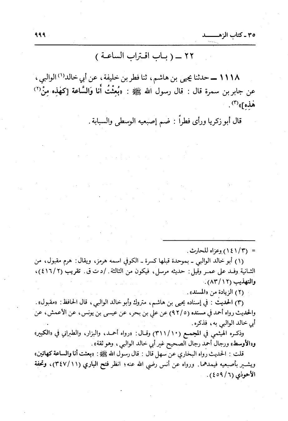 1118 - حَدَّثَنَا يَحْيَى بْنُ هَاشِمٍ , ثنا فِطْرُ بْنُ خَلِيفَةَ , عَنْ أَبِي خَالِدٍ الْوَالِبِيِّ , عَنْ جَابِرِ بْنِ سَمُرَةَ قَالَ: قَالَ رَسُولُ اللَّهِ صَلَّى اللهُ عَلَيْهِ وَسَلَّمَ: «§بُعِثْتُ أَنَا وَالسَّاعَةُ كَهَذِهِ مِنْ هَذِهِ» , قَالَ: أَبُو زَكَرِيَّا وَرَأَى فِطْرًا ضَمَّ أُصْبُعَيْهِ الْوُسْطَى وَالسَّبَّابَةَ