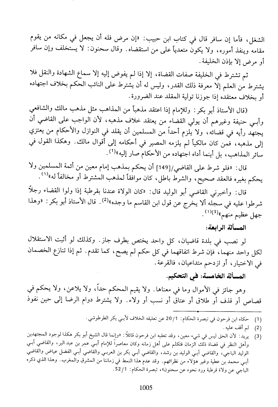 (قال الأستاذ أبو بكر: وللإمام إذا اعتقد مذهبًا من المذاهب مثل مذهب مالك والشافعي وأبي حنيفة وغيرهم أن يولي القضاء من يعتقد خلاف مذهبه، لأن لواجب على القاضي أن يجتهد رأيه في قضائه، ولا يلزم أحدًا من المسلمين أن يقلد في النوازل والأحكام من يعتري إلى مذهبه، فمن كان مالكيًا لم يلزمه المصير في أحكامه إلى أقوال مالك. وهكذا القول في سائر المذاهب، بل أينما أداه اجتهاده من الأحكام صار إليه".