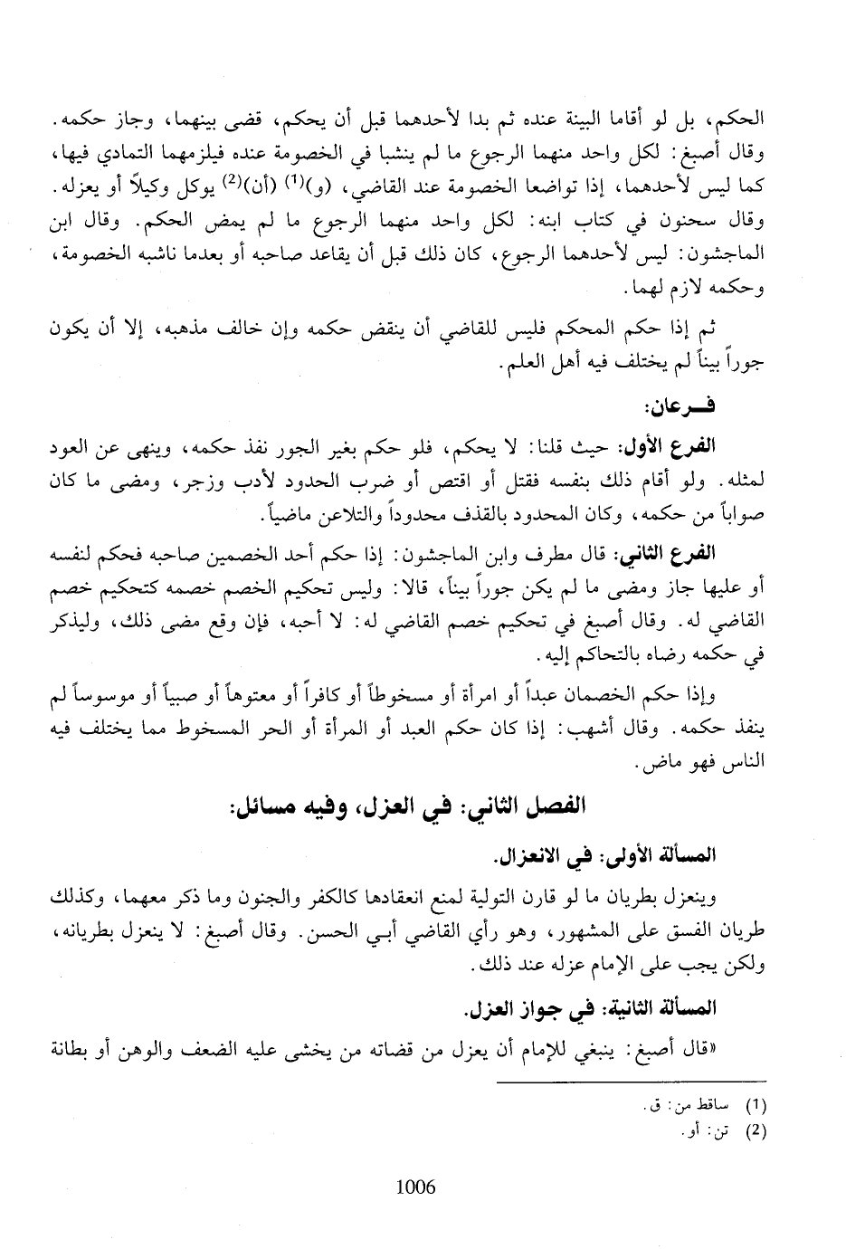 "قال أصبغ: ينبغي للإمام أن يعزل من قضاته من يخشى عليه الضعف والوهن أو بطانة