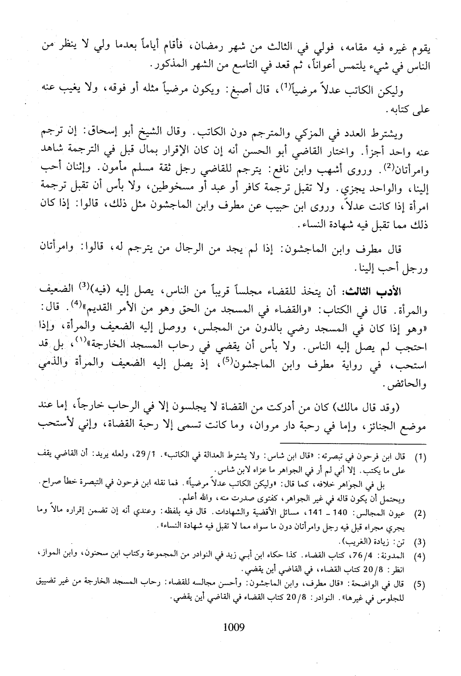 وليكن الكاتب عدلاً مرضيًا، قال أصبغ: ويكون مرضيًا مثله أو فوقه، ولا يغيب عنه على كتابه.