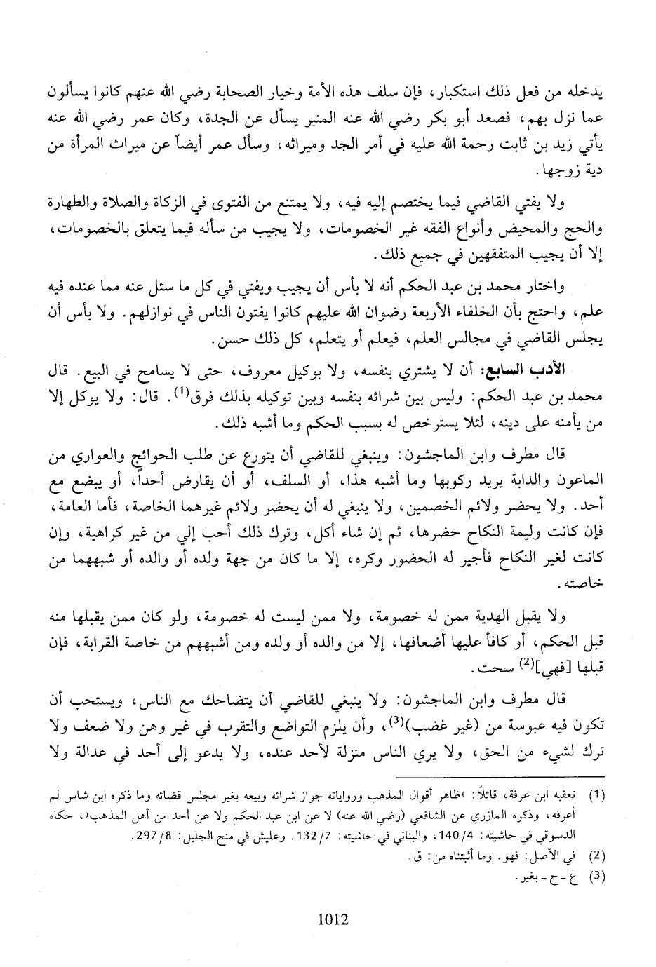 الأدب السابع: أن لا يشتري بنفسه، ولا بوكيل معروف، حتى لا يسامح في البيع. قال محمد بن عبد الحكم: وليس بين شرائه بنفسه وبين توكيله بذلك فرق. قال: ولا يوكل إلا من يأمنه على دينه، لئلا يسترخص له بسبب الحكم وما أشبه ذلك.