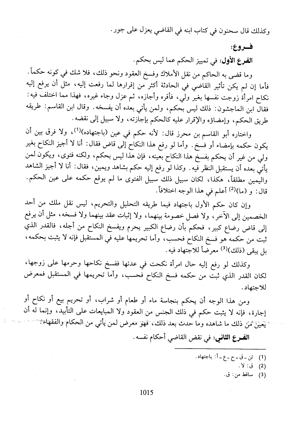 ومن هذا الوجه أن يحكم بنجاسة ماء أو طعام أو شراب، أو تحريم بيع أو نكاح أو إجارة، فإنه لا يثبت حكم في ذلك الجنس من العقود ولا المبايعات على التأييد، وإنما له أن يعين من ذلك ما شاهده وما حدث بعد ذلك، فهو معرض لمن يأتي من الحكام والفقهاء.