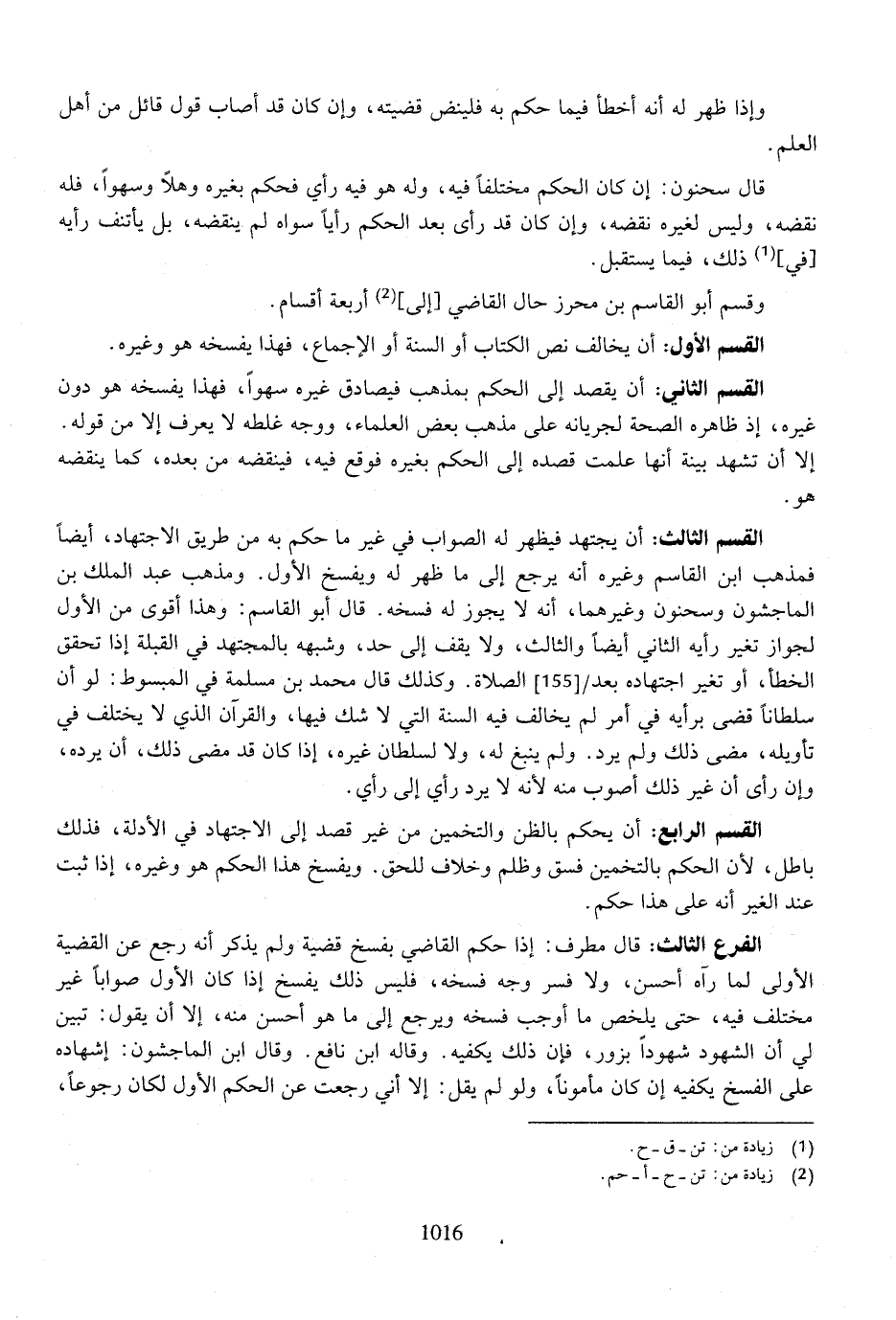 القسم الثالث: أن يجتهد فيظهر له الصواب في غير ما حكم به من طريق الاجتهاد، أيضًا فمذهب ابن القاسم وغيره أنه يرجع إلى ما ظهر له ويفسخ الأول. ومذهب عبد الملك بن الماجشون وسحنون وغيرهما، أنه لا يجوز له فسخه. قال أبو القاسم: وهذا أقوى من الأول لجواز تغير رأيه الثاني أيضًا والثالث، ولا يقف إلى حد، وشبهة بالمجتهد في القبلة إذا تحقق الخطأ، أو تغير اجتهاده بعد الصلاة. وكذلك قال محمد بن مسلمة في المبسوط: لو أن سلطانًا قضى برأيه في أمر لم يخالف فيه السنة التي لا شك فيها، والقرآن الذي لا يختلف في تأويله، مضى ذلك ولم يرد. ولم ينبغ له، ولا السلطان غيره، إذا كان قد مضى ذلك، أن يرده، وإن رأى أن غير ذلك أصوب منه لأنه لا يرد رأي إلى رأي.