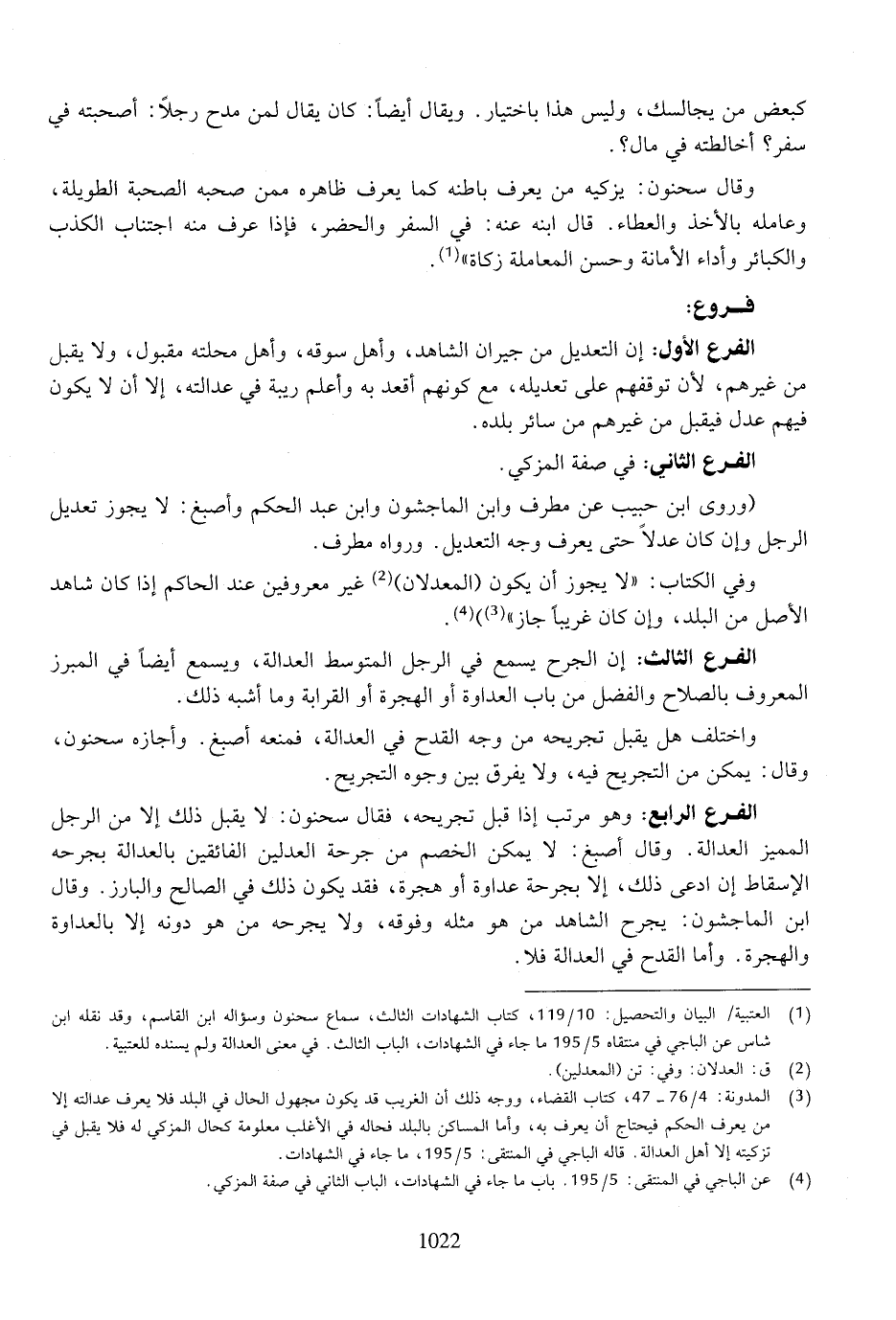 وقال سحنون: يزكيه من يعرف باطنه كما يعرف ظاهره ممن صحبه الصحبة الطويلة، وعامله بالأخذ والعطاء. قال ابنه عنه: في السفر والحضر، فإذا عرف منه اجتناب الكذب والكبائر وأداء الأمانة وحسن المعاملة زكاة".