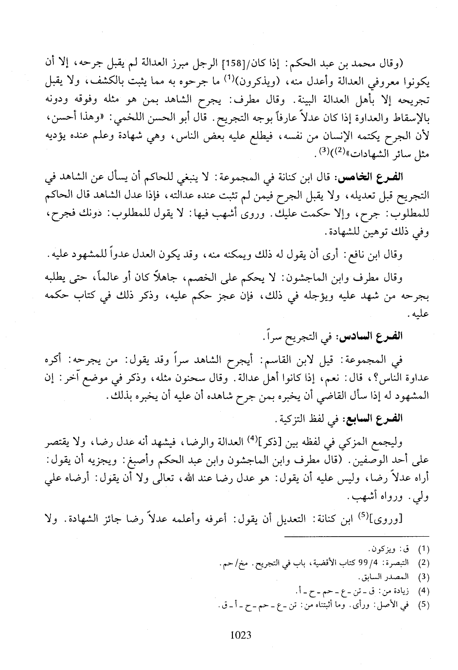 (وقال محمد بن عبد الحكم: إذا كان الرجل مبرز العدالة لم يقبل جرحه، إلا أن يكونوا معروفي العدالة وأعدل منه، (ويذكرون) ما جرحوه به مما يثبت بالكشف، ولا يقبل تجريحه إلا بأهل العدالة البينة. وقال مطرف: يجرح الشاهد بمن هو مثله وفوقه ودونه بالإسقاط والعداوة إذا كان عدلاً عارفاً بوجه التجريح. قال أبو الحسن اللخمي: "وهذا أحسن، لأن الجرح يكتمه الإنسان من نفسه، فيطلع عليه بعض الناس، وهي شهادة وعلم عنده يؤديه مثل سائر الشهادات".