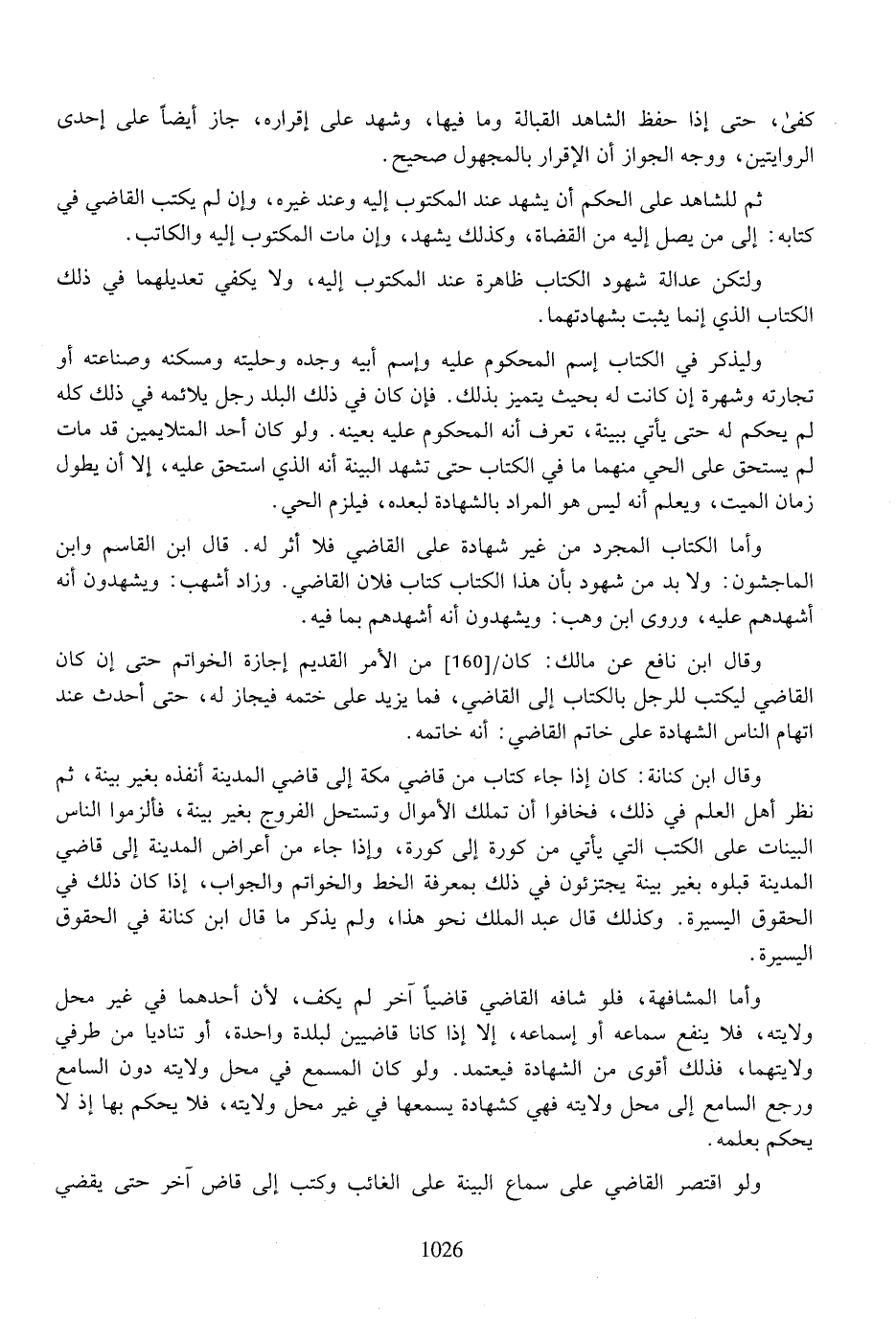 وقال ابن كنانة: كان إذا جاء كتاب من قاضي مكة إلى قاضي المدينة أنفذه بغير بينة، ثم نظر أهل العلم في ذلك، فخافوا أن تملك الأموال وتستحل الفروج بغير بينة، فألزموا الناس البينات على الكتب التي يأتي من كورة إلى كورة، وإذا جاء من أعراض المدينة إلى قاضي المدينة قبلوه بغير بينة يجتزئون في ذلك بمعرفة الخط والخواتم والجواب، إذا كان ذلك في الحقوق اليسيرة. وكذلك قال عبد الملك نحو هذا، ولم يذكر ما قال ابن كنانة في الحقوق اليسيرة.