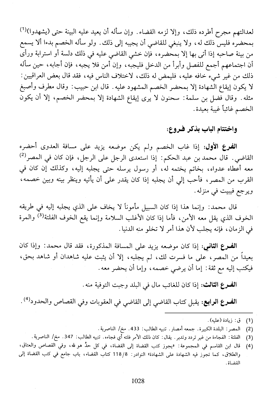 الفرع الثاني: إذا كان موضعه يزيد على المسافة المذكورة، فقد قال محمد: وإذا كان بعيدًا من المصر، على ما فسرت لك، لم يجلبه، إلا أن يثبت عليه شاهدان أو شاهد بحق، فيكتب إليه مع ثقة: إما أن يرضي خصمه، وإما أن يحضر معه.