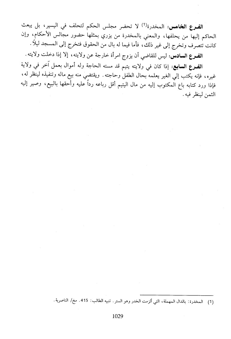الفرع الخامس: المخدرة لا تحضر مجلس الحكم لتحلف في اليسير، بل يبعث الحاكم إليها من يحلفها، والمعني بالمخدرة من يزري بمثلها حضور مجال الأحكام، وإن كانت تتصرف وتخرج إلى غير ذلك، فأما فيما له بال من الحقوق فتخرج إلى المسجد ليلاً.