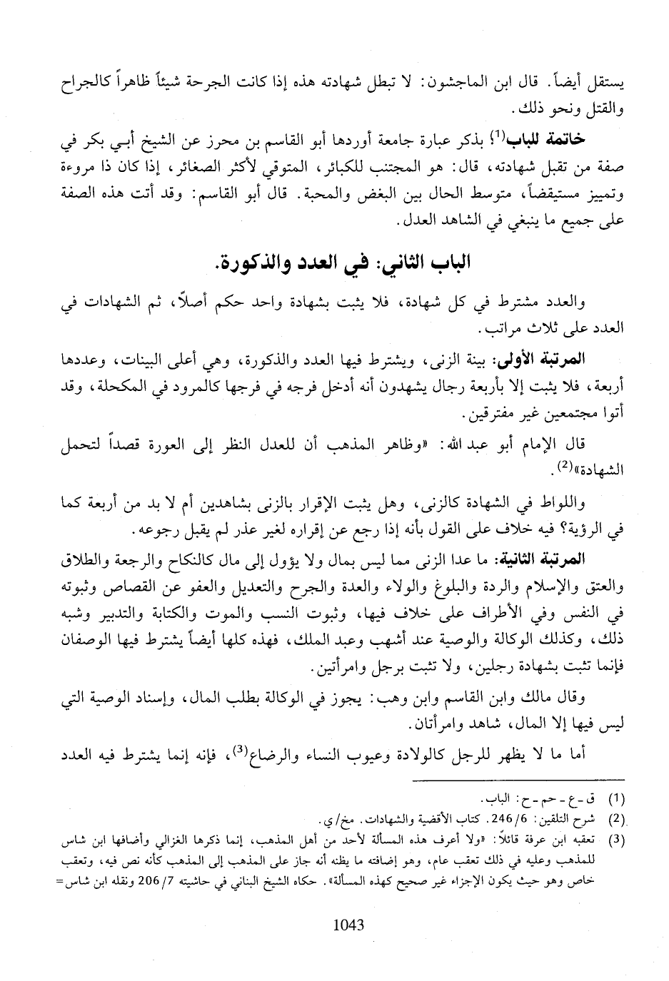 المرتبة الثانية: ما عدا الزنى مما ليس بمال ولا يؤول إلى مال كالنكاح والجرعة والطلاق والعتق والإسلام والردة والبلوغ والولاء والعدة والجرح والتعديل والعفو عن القصاص وثبوته في النفس وفي الأطراف على خلاف فيها، وثبوت النسب والموت والكتابة والتدبير وشبه ذلك، وكذلك الوكالة والوصية عند أشهب وعبد الملك، فهذه كلها أيضًا يشترط فيها الوصفان فإنما تثبت بشهادة رجلين، ولا تثبت برجل وامرأتين.