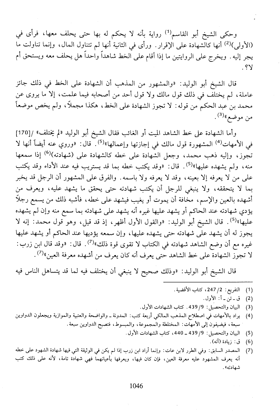 وأما الشهادة على خط الشاهد الميت أو لغائب فقال الشيخ أبو الوليد "لم يختلف" في الأمهات المشهورة قول مالك في إجازتها وإعمالها". قال: "وروي عنه أيضًا أنها لا تجوز، وإليه ذهب محمد، وجعل الشهادة على خطه كالشهادة على (شهادته) إذا سمعها منه، ولم يشهده عليها". قال: "وقد يكتب خطه بما قد يستريب فيه عند الأداء وقد يكتب على من لا يعرفه إلا بعينه، وقد لا يعرفه ولا باسمه. والفرق على المشهور أن الرجل قد يخبر بما لا يتحققه، ولا ينبغي للرجل أن يكتب شهادته حتى يحقق ما يشهد عليه، ويعرف من أشهد بالعين والاسم، مخافة أن يموت أو يغيب فيشهد على خطه، فأشبه ذلك من يسمع رجلاً يؤدي شهادته عند الحاكم أو يشهد عليها غيره أنه يشهد على شهادته بما سمع منه وإن لم يشهده عليها". قال الشيخ أبو الوليد: "والقول الأول أظهر، إذ قد قيل، وهو قول محمد: إنه لا يجوز له أن يشهد على شهادته حتى يشهده عليها، وإن سمعه يؤديها عند الحاكم أو يشهد عليها غيره مع أن وضع الشاهد شهادته في الكتاب لا قوى قوة ذلك. قال: "وقد قال ابن زرت: لا تجوز الشهادة على خط الشاهد حتى يعرف أنه كان يعرف من أشهده معرفة العين".