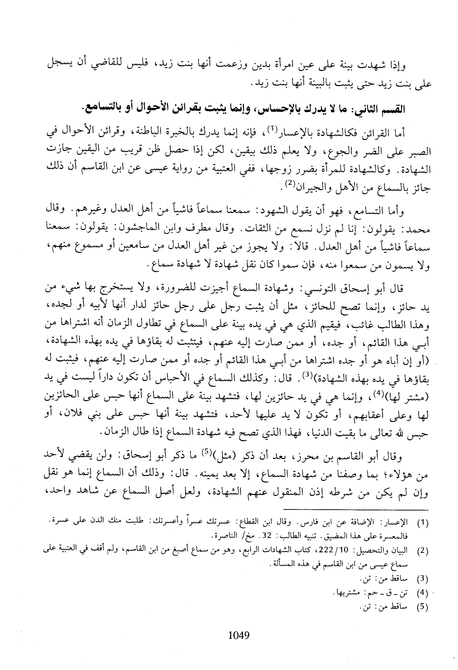 وقال أبو القاسم بن محرز، بعد أن ذكر (مثل) ما ذكر أبو إسحاق: ولن يقضي لأحد من هؤلاء؛ بما وصفنا من شهادة السماع، إلا بعد يمينه. قال: وذلكم أن السماع إنما هو نقل وإن لم يكن من شرطه إذن المنقول عنهم الشهادة، ولعل أصل السماع عن شاهد واحد،