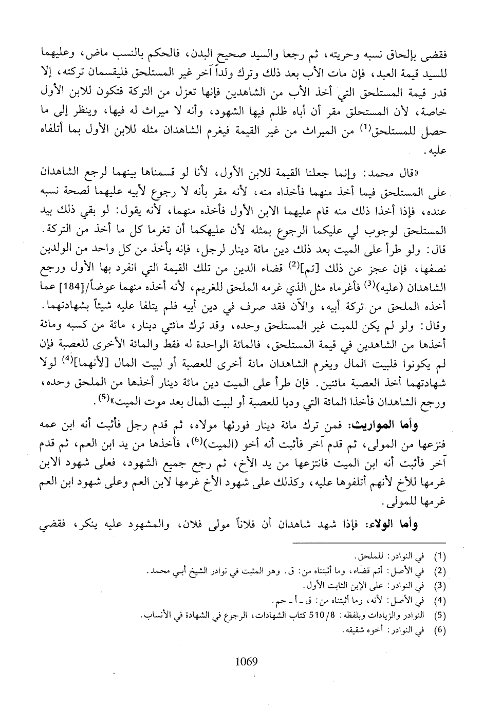"قال محمد: وإنما جعلنا القيمة للابن الأول، لا، الو قسمناه بينهما لرجع الشاهدان على المستلحق فيما أخذ منهما فأخذاه منه، لأنه مقر بأنه لا رجوع لأبيه عليهما لصحة نسبه عنده، فإذا أخذا ذلك منه قام عليهما الابن الأول فأخذه منهما، لأنه يقول: لو بقي ذلك بيد المستلحق لوجوب لي عليكما الرجوع بمثله لأن عليهما أن تغرما كل ما أخذ من التركة. قال: ولو طرأ على الميت بعد ذلك دين مائة دينار لرجل، فإنه يأخذ من كل واحد من الولدين نصفها، فإن عجز عن ذلك [تم] قضاء الدين من تلك القيمة التي انفرد بها الأول ورجع الشاهدان (عليه) فأغرماه مثل الذي غرمه الملحق للغريم، لأنه أخذه منهما عوضًا عما أخذه الملحق من تركة أبيه، والآن فقد صرف في دين أبيه فلم يتلفا عليه شيء اً بشهادتهما. وقال: ولو لم يكن للميت غير المستلحق وحده، وقد ترك مائتي دينار، مائة من كسبه ومائة أخذها من الشاهدين في قيمة المستلحق، فالمائة الواحدة له فقط والمائة الاخرى للعصبة فإن لم يكونوا فلبيت المال ويغرم الشاهدان مائة أخرى للعصبة أو لبيت المال [لأنهما] لولا شهادتهما أخذ العصبة مائتين. فإن طرأ على الميت دين مائة دينا أخذها من الملحق وحده، ورجع الشاهدان فأخذا المائة التي وديا للعصبة أو لبيت المال بعد موت الميت".