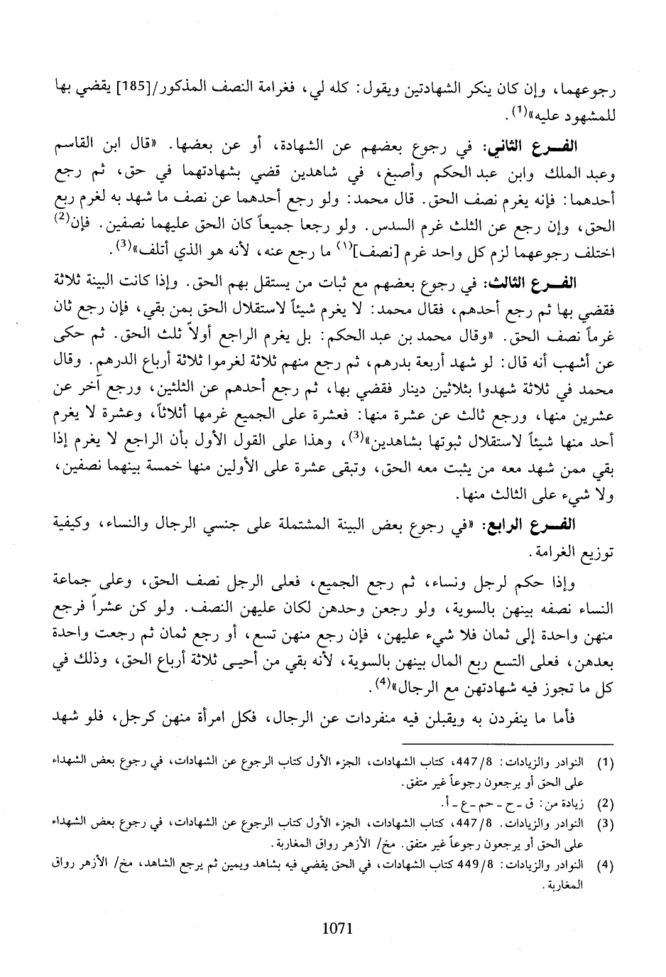 الفرع الثاني: في رجوع بعضهم عن الشهادة، أو عن بعضها. "قال ابن القاسم وعبد الملك وابن عبد الحكم وأصبغ، في شاهدين قضي بشهادتهما في حق، ثم رجع أحدهما: فإنه يغرم نصف الحق. قال محمد: ولو رجع أحدهما عن نصف ما شهد به لغرم ربع الحق، وإن رجع عن الثلث غرم لسدس. ولو رجعا جميعًا كان الحق عليهما نصفين. فإن اختلف رجوعهما لزم كل واحد غرم [نصف] ما رجع عنه، لأنه هو الذي أتلف".