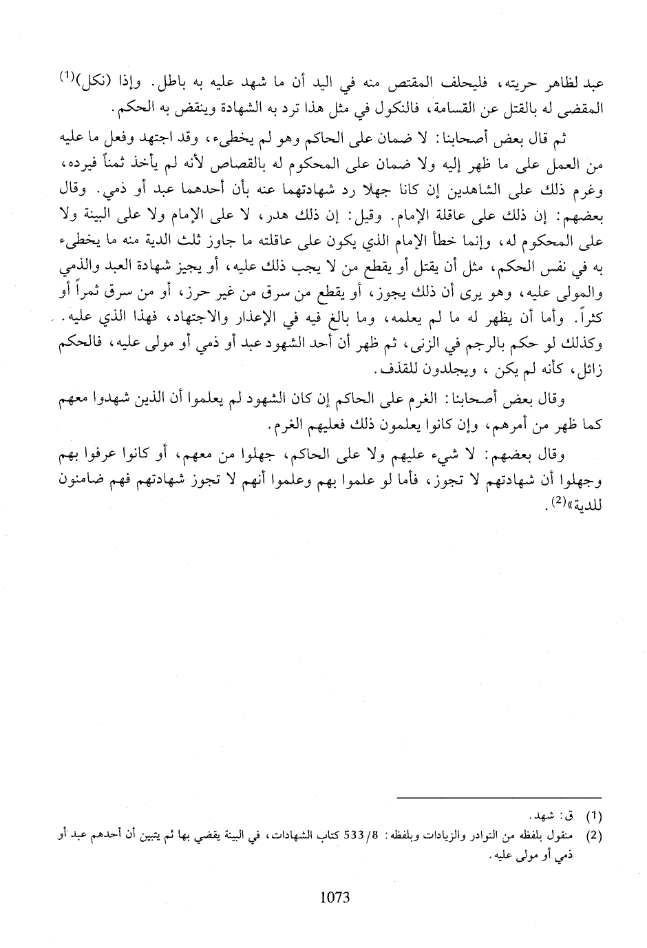 ثم قال بعض أصحابنا: لا ضمان على الحاكم وهو لم يخطئ، وقد اجتهد وفعل ما عليه من العمل على ما ظهر إليه ولا ضمان على المحكوم له بالقصاص لأنه لم يأخذ ثمنًا فيرده، وغرم ذلك على الشاهدين إن كانا جهلاً رد شهادتهما عنه بأن أحدهما عبد أو ذمي. وقال بعضهم: إن ذلك على عاقلة الإمام. وقيل: إن ذلك هدر، لا على الإمام ولا على البينة ولا على المحكوم له، وإنما خطأ الإمام الذي يكون على عاقلته ما جاوز ثلث الدية منه ما يخطئ به في نفس الحكم، مثل أن يقتل أو يقص من لا يجب ذلك عليه، أو يجيز شهادة العبد والذمي والمولى عليه، وهو يرى أن ذلك يجوز، أو يقطع من سرق من غير حرز، أو من سرق ثمرًا أو كثرًا. وأما يظهر له ما لم يعلمه، وما بالغ فيه في الإعذار والاجتهاد، فهذا الذي عليه. وكذلك لو حكم بالرجم في الزنى، ثم ظهر أن أحد الشهود عبد أو ذمي أو مولى عليه، فالحكم زائل، كأنه لم يكن، ويجلدون للقذف.
