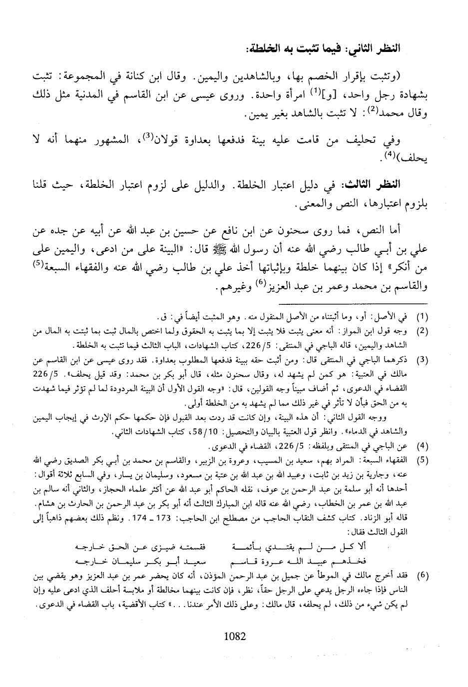 أما النص، فما روى سحنون عن ابن نافع عن حسين بن عبد لله عن أبيه عن جده علي بن أبي طالب رضي الله عنه أن رسول الله صلى الله عليه وسلم قال: "البينة على من ادعى، واليمين على من أنكر" إذا كان بينهما خلطة وبإثباتها أخذ علي بن أبي طالب رضي الله عنه والفقهاء السبعة والقاسم بن محمد وعمر بن عبد العزيز وغيرهم.