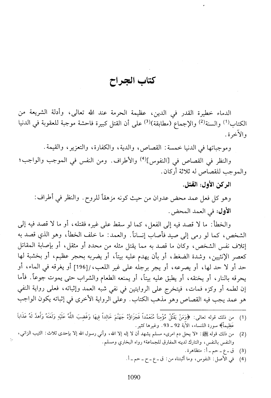 الدماء خطيرة القدر في الدين، عظيمة الحرمة عند الله تعالى، وأدلة الشريعة من الكتاب ولاسنة والإجماع (مطابقة) على أن القتل كبيرة فاحشة موجبة للعقوبة في الدنيا والآخرة.