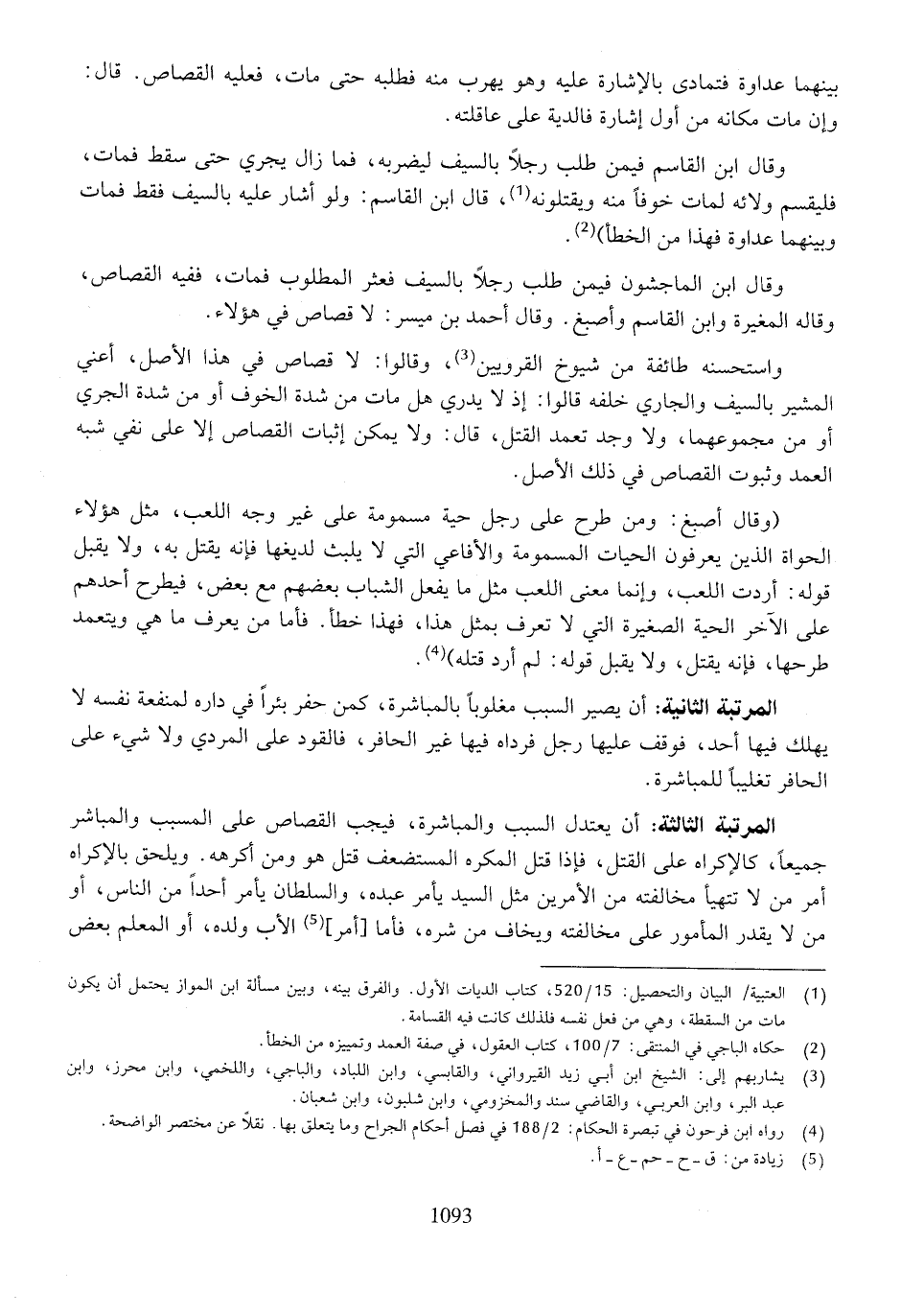 المرتبة الثانية: أن يصير السبب مغلوبًا بالمباشرة، كمن حفر بئرًا في داره لمنفعة نفسه لا يهلك فيها أحد، فوقف عليها رجل فرداه فيها غير الحافر، فالقود على المردي ولا شيء على الحافر تغليبًا للمباشرة.